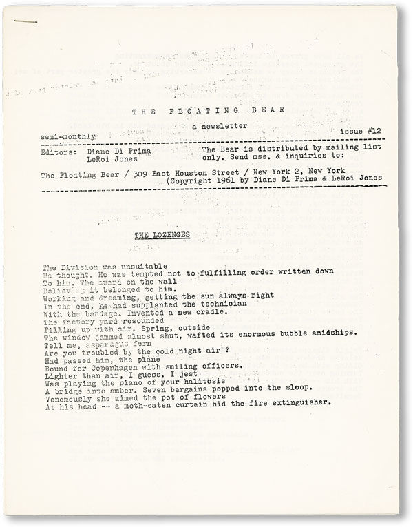 New York: The Floating Bear, 1961. First Edition. Quarto (28cm.); side-stapled mimeographed self-wrappers; [12]pp. A Fine and unfolded (possibly unissued) copy, as the magazine sold only through its mailing list. Contents chiefly devoted to the poetry of John Ashbery, and provides a notice on p. [12] that the poet "is now looking for manuscripts (poems) for Locus Solus 3." Concludes with the plea "We are, as ever, badly in need of money for Bears. This isn't addressed to those of you who have done more than your share, but to you guys who have as yet done nothing: PLEASE SEND WHATEVER YOU CAN, AS SOON AS YOU CAN.