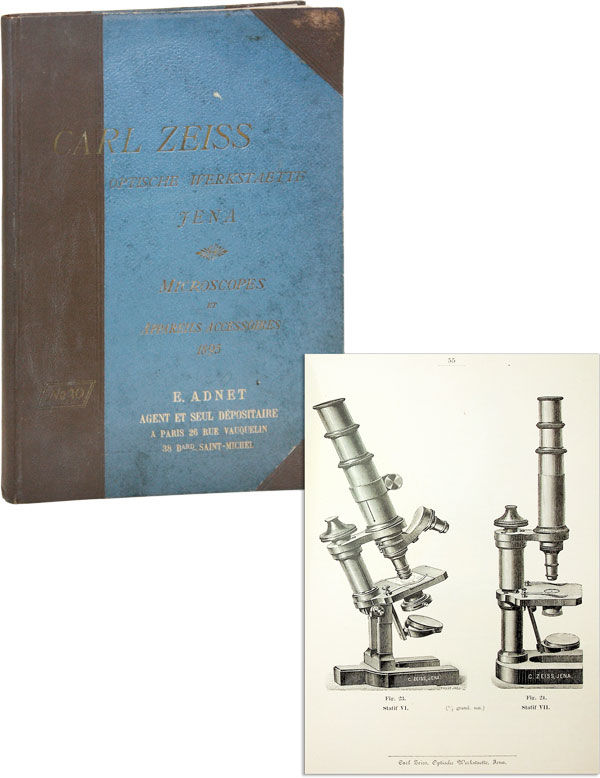 Jena: Carl Zeiss, 1895. First Edition. Large, slim octavo (27cm.); publisher's brown cloth over blue textured paper, upper cover lettered in gilt; [4],122pp.; steel-engraved text illus. throughout. Boards a bit rubbed and slightly bowed, small spot of glue residue at top fore-edge corner of upper cover, original gilt quite dulled, though Parisian distributor's gilt-lettered cancel still brilliant, contemporary American ownership inscriptions to front endpapers. Overall Very Good, internally fine. Quite an attractive and uncommon trade catalog issued by the still-extant microscope manufacturer. This issue not separately catalogued in OCLC, COPAC, or KVK as of January, 2020.