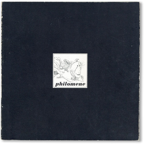 [Hilversum, Holland: Steendrukkerij de Jong & Co, 1966]. First Edition. Slim square quarto (25cm.); publisher's black pictorial card wrappers, French flaps; [79]pp.; chiefly illus. Extremities rubbed, else Very Good, internally sound. Wordless novel describing the marvelous adventures of Philomene, who happens to lose her clothes very early on in the story. The work was apparently published as a promotional gift for the editors (https://www. lambiek. net).