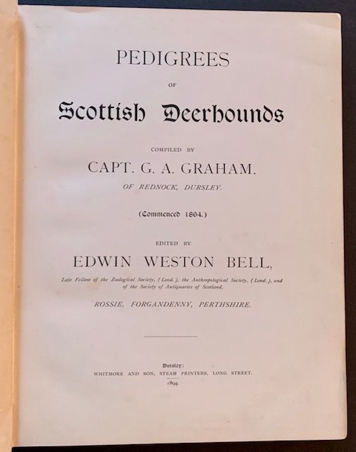 Dursley, Gloucestershire, England: Whitmore and Son, 1894. Cloth. Very Good. The 1894 1st edition of this uncommon examination of the pedigrees of Scottish Deerhounds. Solid and VG in its wine-red cloth, with bright gilt-titling along the spine. A bit of scuffing and rubbing to the front panel, very light rubbing along the rear panel. Still though, well preserved and very solid, and internally clean as could be, with no writing or markings to speak of. Quarto, highly detailed charts and lineages thruout. Compiled by Capt. G.A. Graham, edited by Edwin Weston Bell.