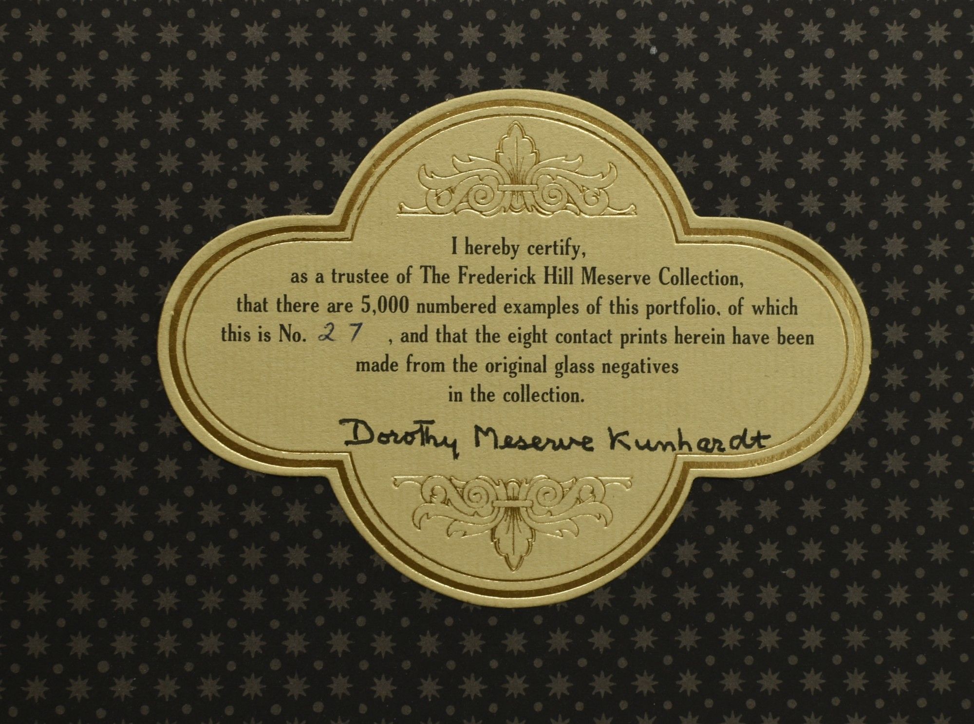 Time-Life Books, 1977. Hard Cover. Fine binding. A beautiful copy of a very handsome production.~Portfolio in silk-covered clamshell box;, still housed in the original shipping box. With eight photographs in folders printed from the original glass negatives of the Matthew B. Brady Gallery in the Meserve Collection; This is #27 of a limited printing of 5000 and signed by Dorothy Meserve Kunhardt, trustee of the Frederick Hill Meserve Collection on the limitation label. Fine binding.