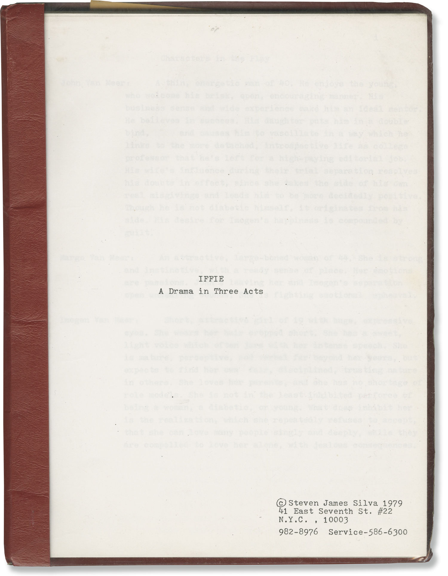 N.p.: N.p., 1979. Draft script for an unproduced film. Laid in with the script is a typed synopsis of the prospective film, with the copied signature of screenwriter Steven James Silva at the bottom. Stapled to the recto of the rear wrapper is a brown paper mailing envelope, ostensibly the one used to ship the script to its recipient.