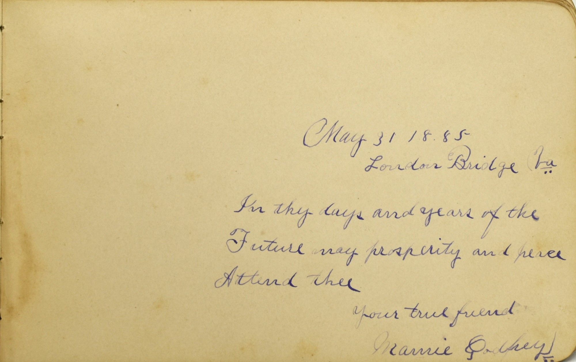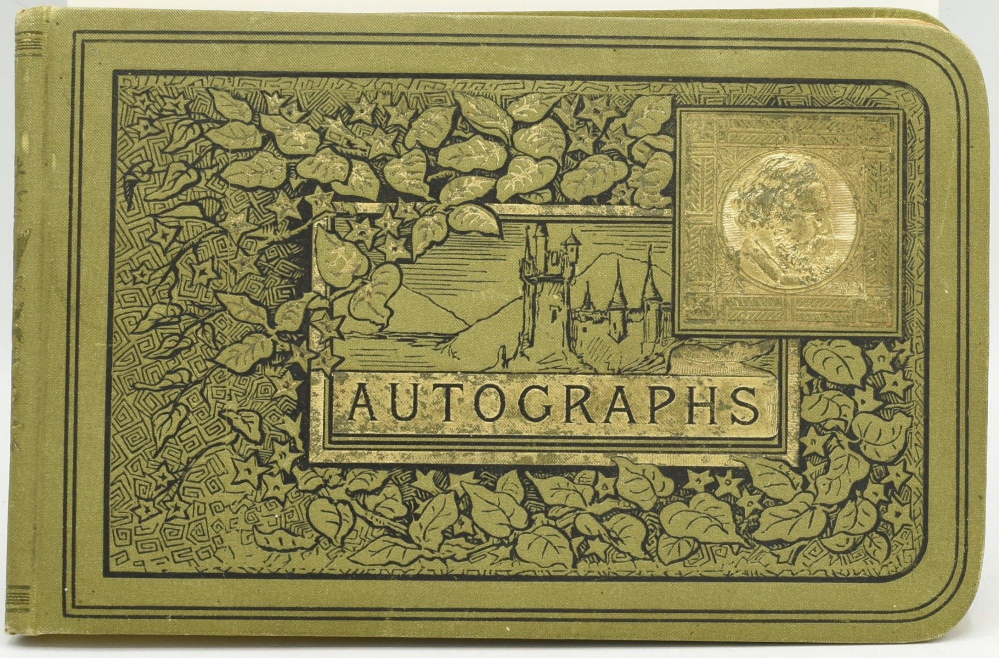 [Norfolk, Virginia], 1886. Hard Cover. Good binding. The autograph album of Lottie Moore Banks, with autographs by many of her relatives, including Lizzie Moore Winingder, and what appears to be Henry Virginius Moore, among others. Virginius served as 1st Sgt., 1st Co. H, 16th Virginia Infantry Regiment, and Lieutenant of the Norfolk Light Artillery Blues. Entries are dated between 1881-1886. With ten pages of text, comprised of poetry, whimsical 'forget-me-not' styles of greetings or farewells, and the autographs of many individuals, often dated. Chromolithographic title page, and six additional chromolithographic illustrated plates. Textblock cracked but holding at a few locations, likely from a small number of excised, presumed blank, leaves. Oblong green cloth, decorated in black and gilt, with some shipping to the gilt decorations. All edges gilt. Good binding.