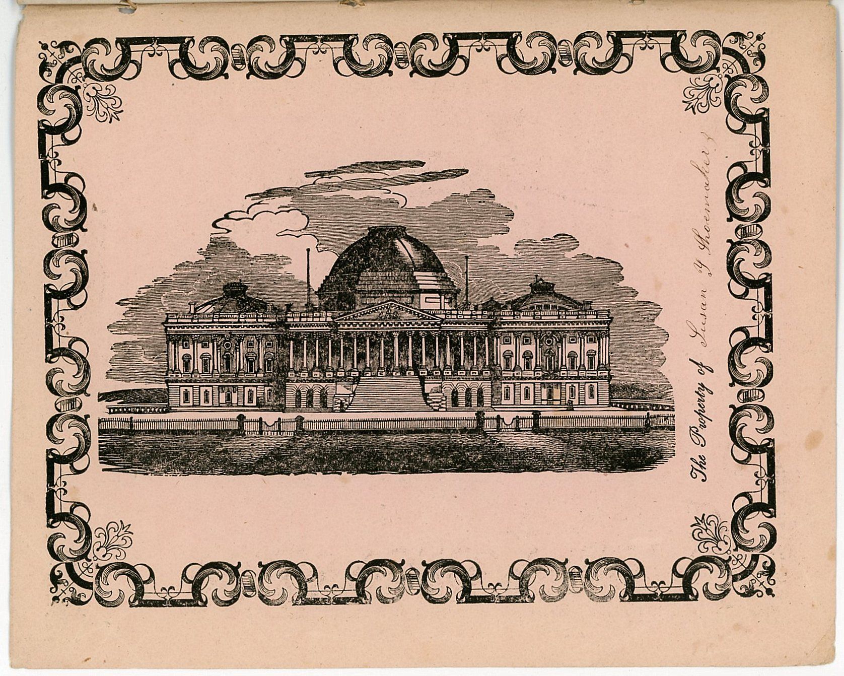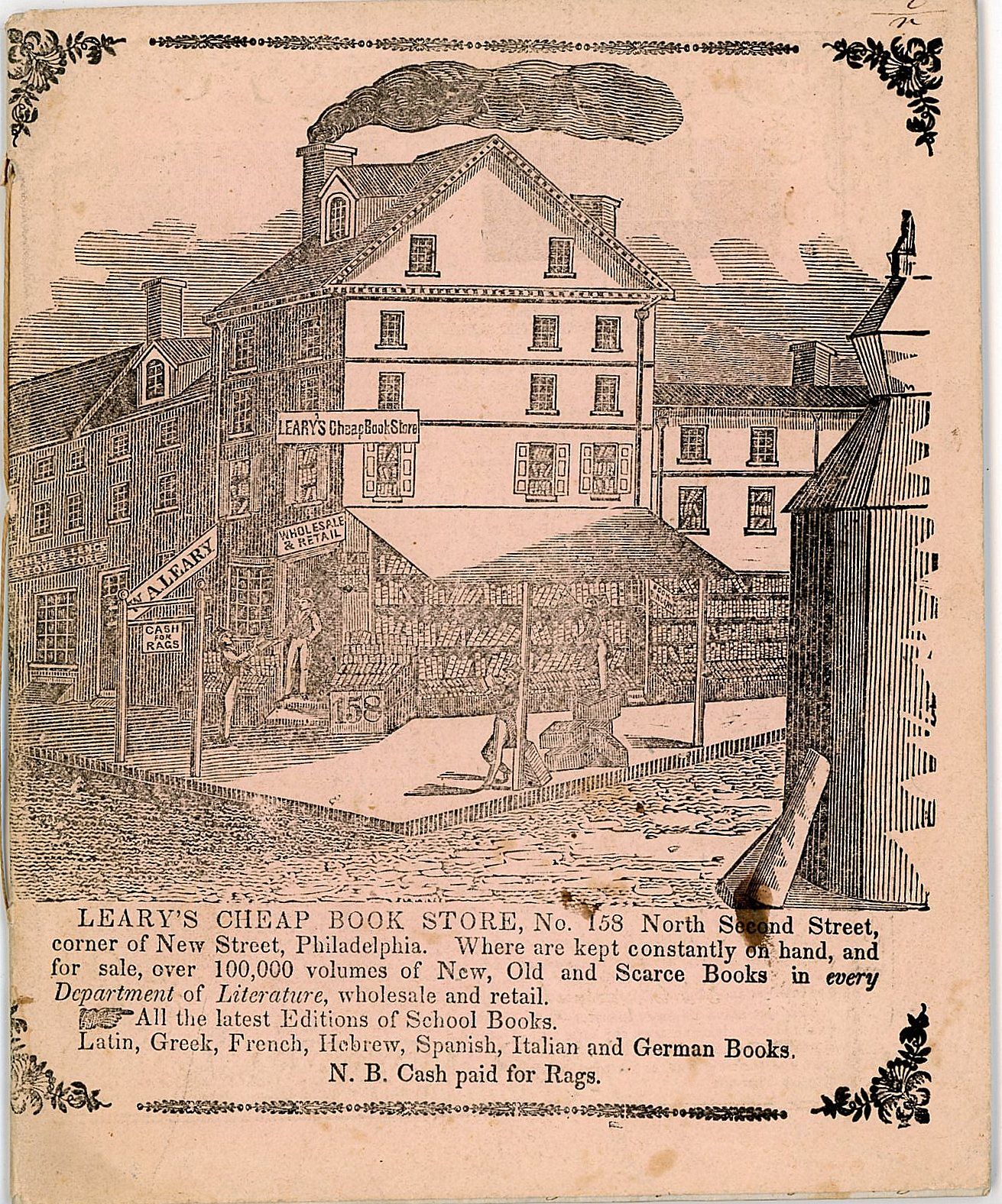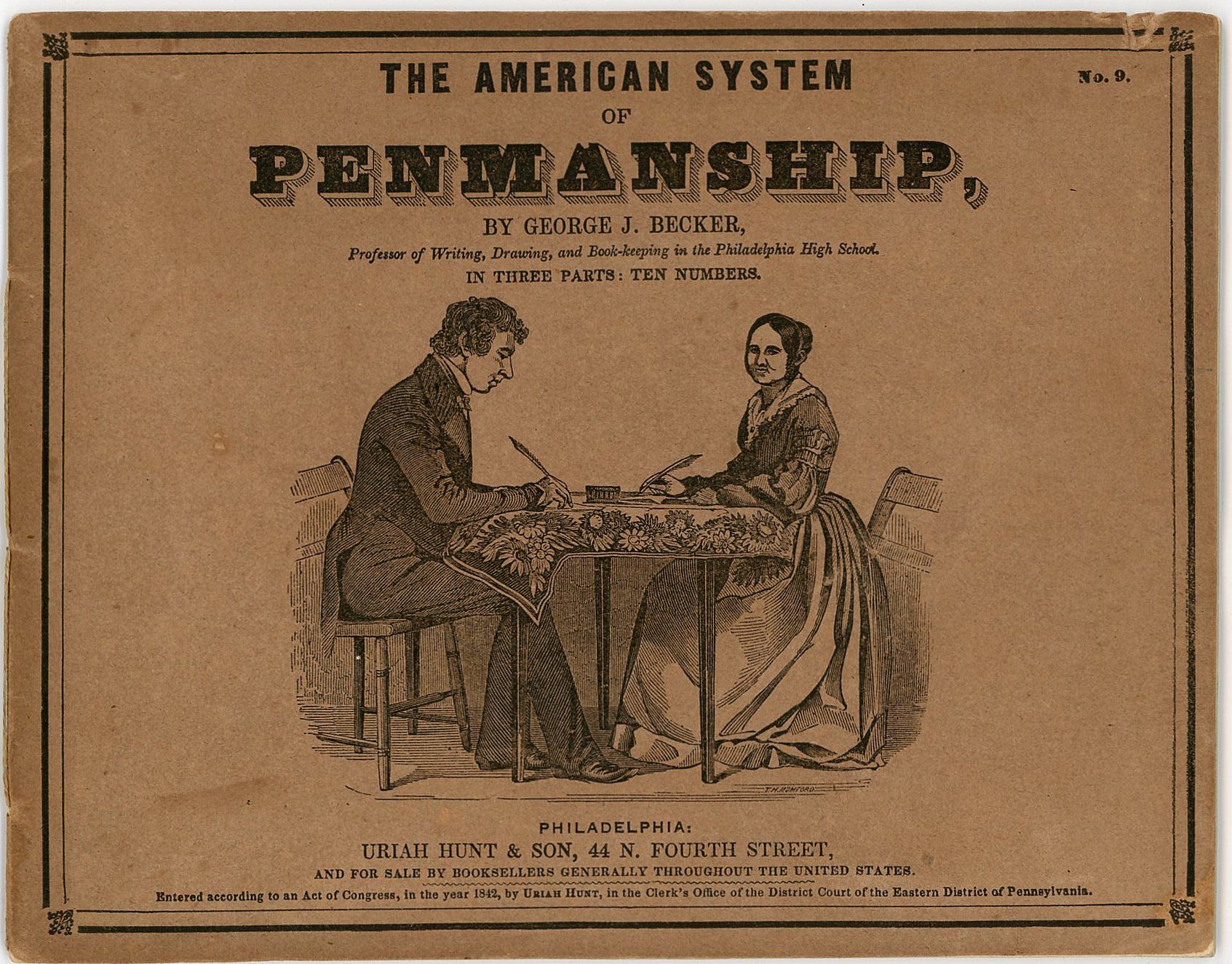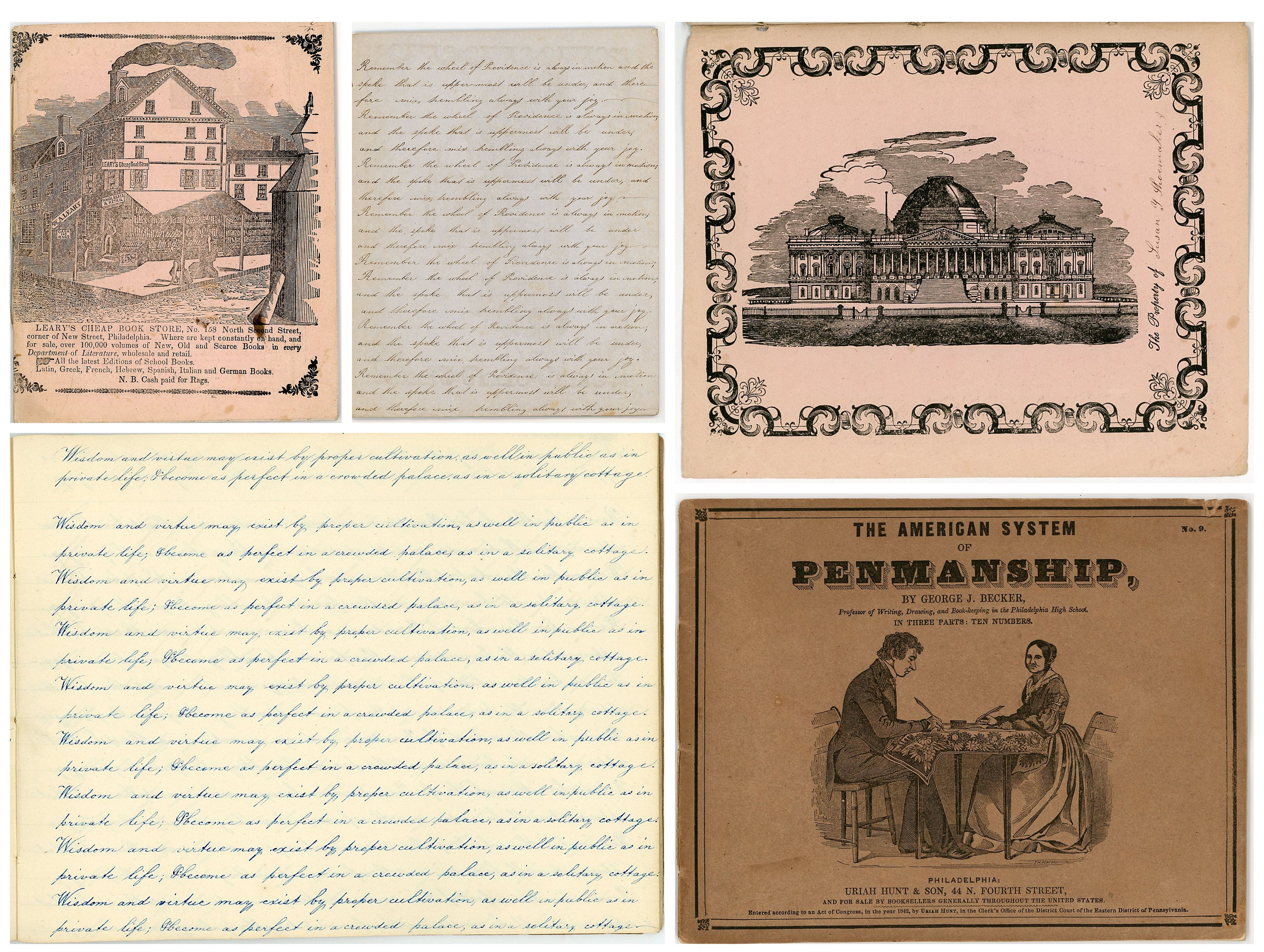 Philadelphia, PA: Uriah Hunt & Son, 1842. General wear. . A pair of copybooks originally belonging to a young girl named Susan Shoemaker who most likely lived in or around Philadelphia, PA (Walnut Grove) in the 1850s. The titles of the copybooks are: 'The American System of Penmanship in Three Parts: Ten Numbers, No. 9' (OCLC 4, Dec 2019) published by Uriah Hunt & Son in Philadelphia, PA in 1842, with the penmanship system itself by George J. Becker and 'Leary's Cheap Book Store Copybook' (OCLC 0, Dec 2019) published by Leary's Cheap Book Store in Philadelphia, PA, with no date. Each page of both books features a new sentence, the majority of which are quite lengthy and have a moral undertone. Some of the phrases are: "The activity of genius is unlimited and the measure of its effects depends entirely upon a steady exertion of its powers", "Never give out while there is hope; but hope not beyond reason; for that shows more desire than judgment", "A man can hardly do a greater service to his neighbor than to instruct and encourage him in the performance of his duties" and "Sins are like circles in the water, when a stone is thrown into it, one produces another. When anger was in Cain's heart, murder was not far off. P. Henry." The front cover of "The American System of Penmanship" features an engraving of man and a woman seated opposite at a table, writing with a quill. The back of the book features instructions on penmanship and a description of the series. Dark brown wrappers. String binding. Measure 8 1/4" x 6 1/2" The front cover of 'Leary's Cheap Book Store Copybook' features an engraving of the street front and store where the notebook was sold - Leary's Cheap Book Store, No. 158 North Second Street. Beneath the engraving is printed "Where are kept constantly on hand, and for sale, over 100,000 volumes of New, Old, and Scarce Books in every Department of Literature, wholesale and retail. All the latest Editions of School Books. Latin, Greek, French, Hebrew, Spanish, Italian, and German Books." Additionally there is a decorative floral border. The back cover of the notebook is information on books sold by the author James Brown who wrote several books on grammar and the English language, that were printed by Leary's Cheap Book Store. The interior cover page has an engraving of the capital building. Tan wrappers. String binding. Measures 7 3/4" x 6 1/4".