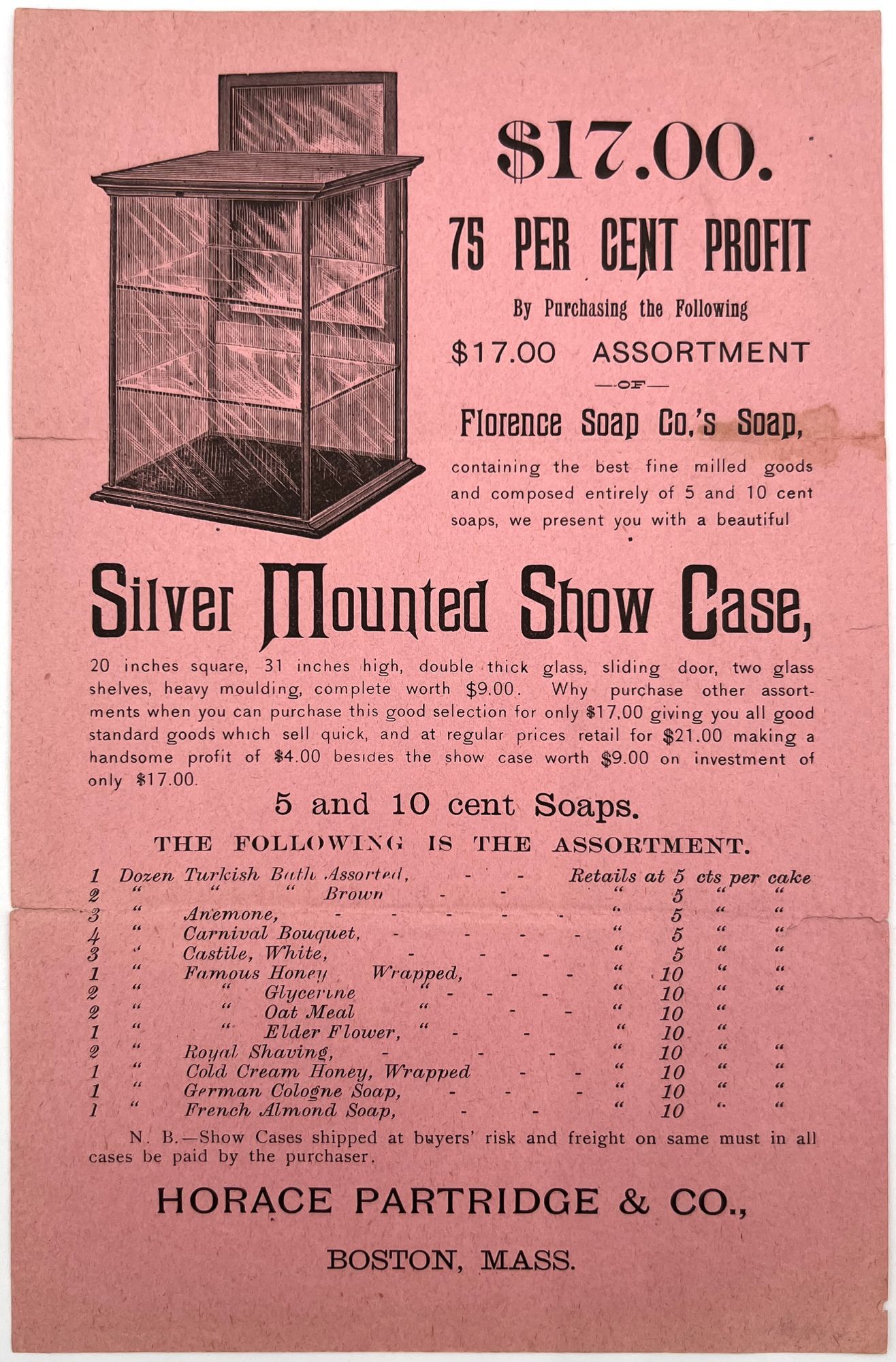 Boston, Massachusetts: Horace Partridge & Co, 1870. Very good. Minor short tears, letter folds, one small water stain to right-hand margin.. Printed handbill distributed to retailers, advertising a silver mounted show case, discounted with the purchase of an assortment of fine soaps by the Florence Soap Co. Includes an illustration of the show case with brief description, as well as pricing and retail pricing for the soaps, which include scenes such as "German Cologne", "French Almond", and "Elder Flower". Provides a window into Boston retail and luxury sales in the 1870s. Single printed leaflet measuring approx. 9.5" by 6", illus., verso blank.