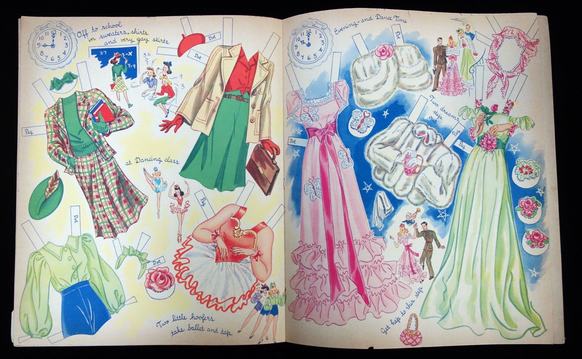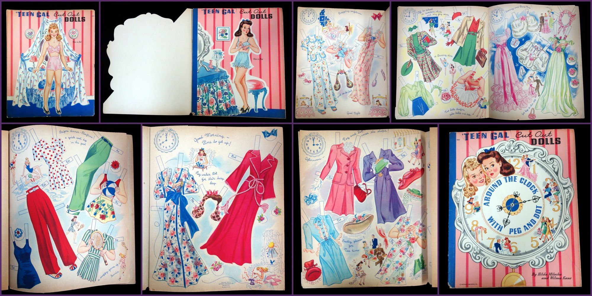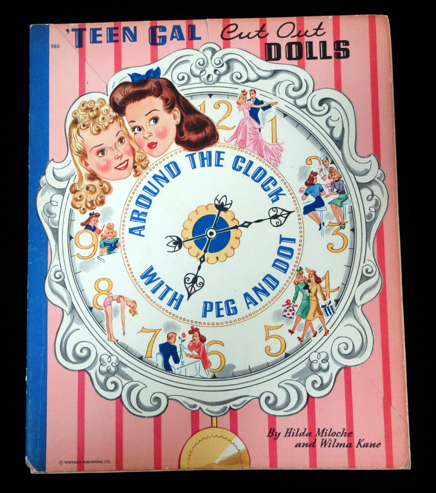Racine , WI: Whitman Publishing Co, 1943. Text block separated from covers. Interior pages toned due to age. The doll dot on the back cover is partially punched out.. Two punch out dolls, Peg and Dot, with six (6) uncut color costume pages. Each outfit on the pages is label the correct corresponding doll. The outfits are designed around the appropriate attire for teens to wear at different times of the day. Each page has an illustration of a clock with the time on it to denote when the fashions on the page can be worn. The outfits include everything form bath robes in the morning, dresses for afternoon tea, school and dance class outfits, evening wear, before dinner playtime outfits and sleep wear. Die cut front cover of an ornate clock. Peggy is the doll beneath this die cut, while dot is on the back cover. 6 costume pages. 2 dolls measuring 11 inches. No. 980. Measures 13" x 10 3/4