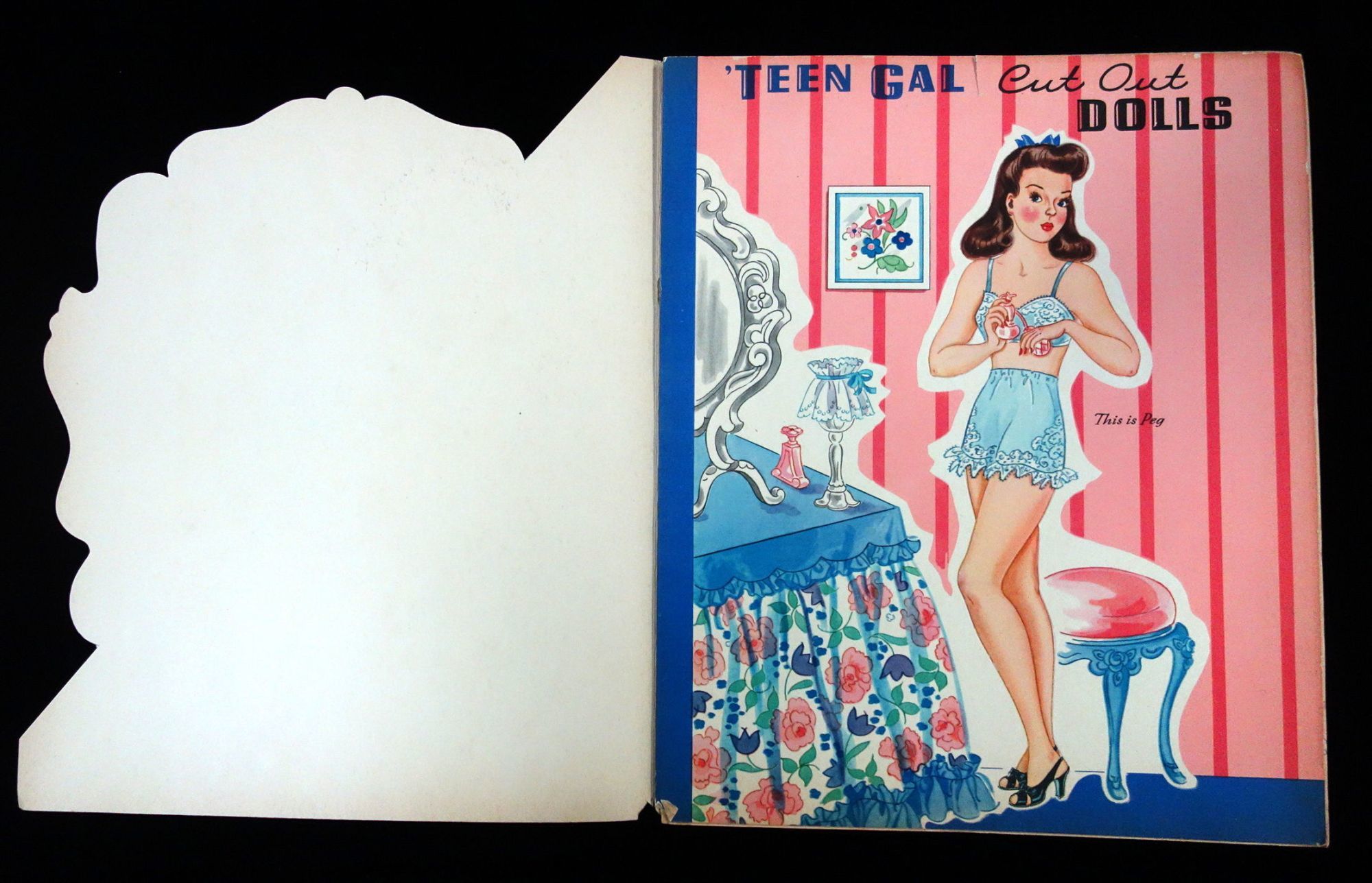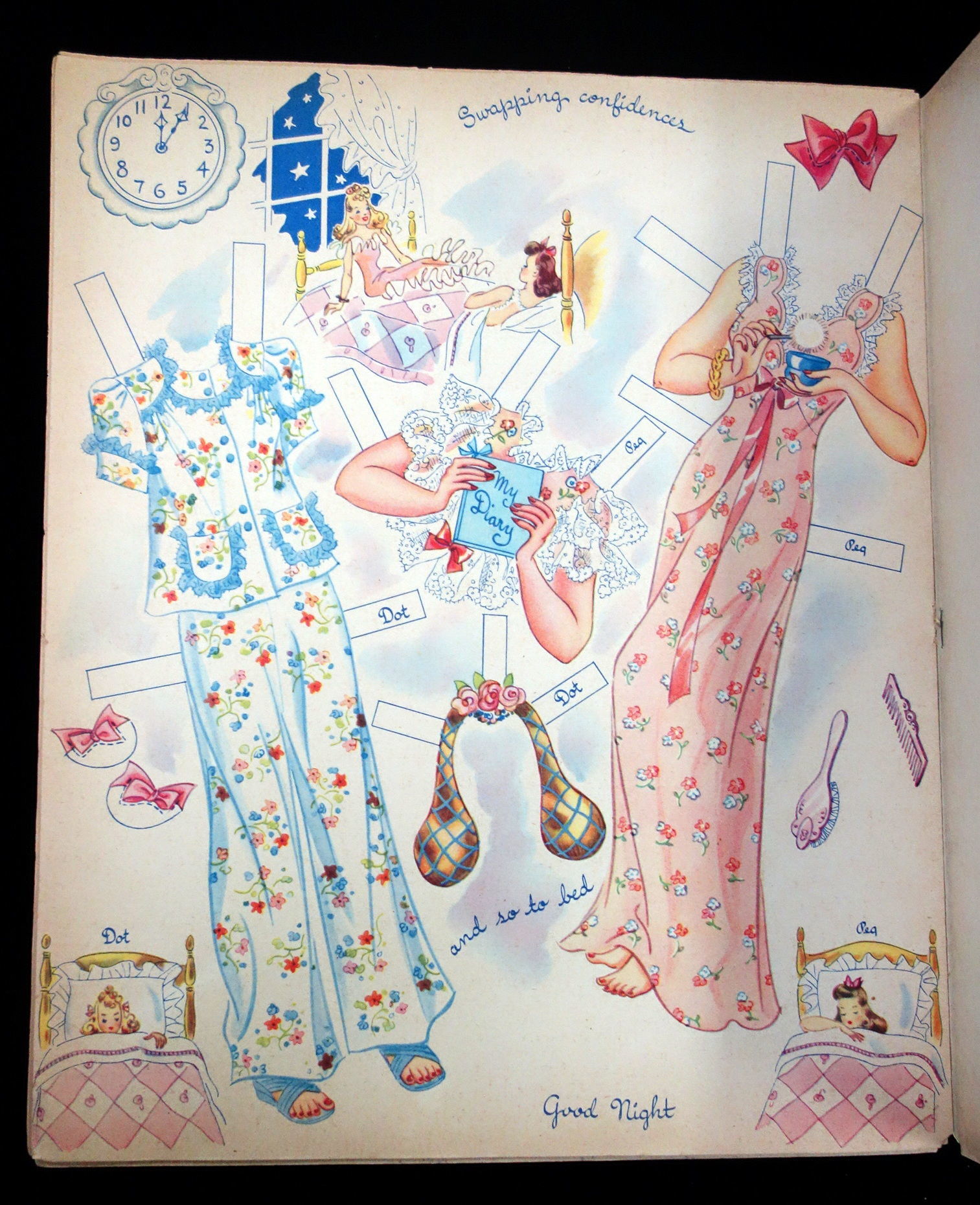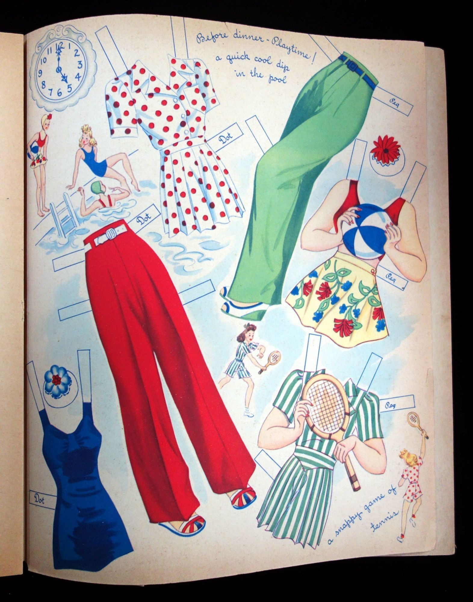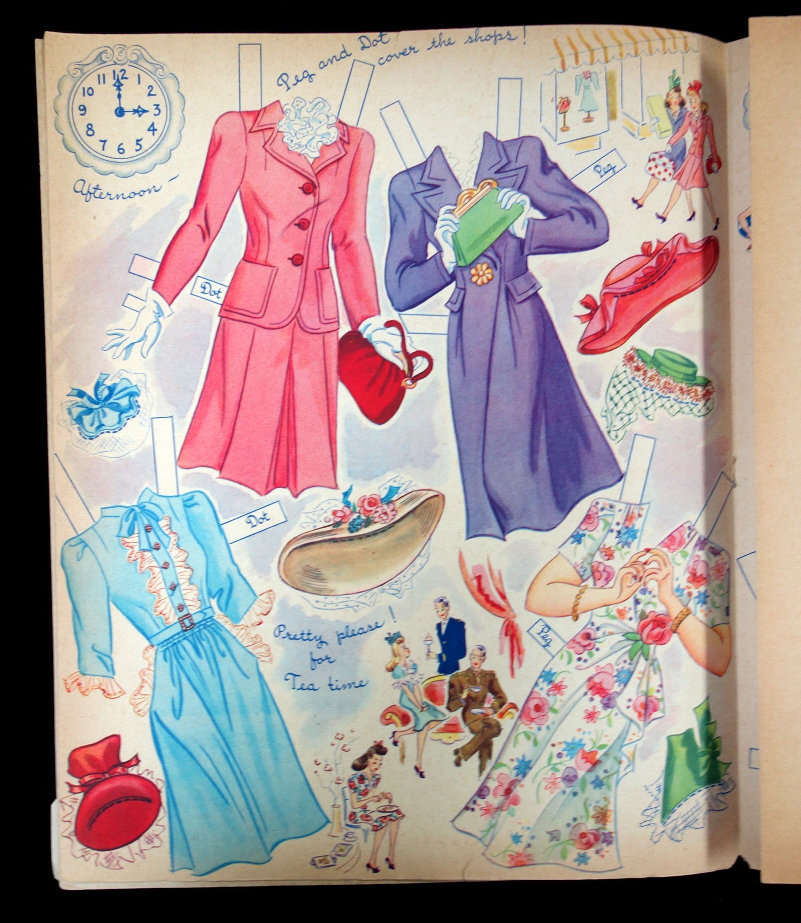 Racine , WI: Whitman Publishing Co, 1943. Text block separated from covers. Interior pages toned due to age. The doll dot on the back cover is partially punched out.. Two punch out dolls, Peg and Dot, with six (6) uncut color costume pages. Each outfit on the pages is label the correct corresponding doll. The outfits are designed around the appropriate attire for teens to wear at different times of the day. Each page has an illustration of a clock with the time on it to denote when the fashions on the page can be worn. The outfits include everything form bath robes in the morning, dresses for afternoon tea, school and dance class outfits, evening wear, before dinner playtime outfits and sleep wear. Die cut front cover of an ornate clock. Peggy is the doll beneath this die cut, while dot is on the back cover. 6 costume pages. 2 dolls measuring 11 inches. No. 980. Measures 13" x 10 3/4