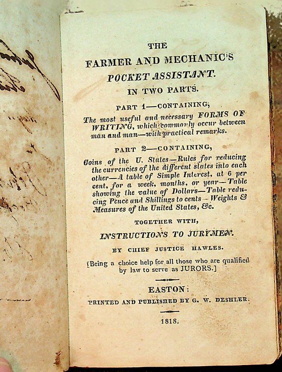 The Farmer and mechanic's pocket assistant. : In two parts. Part 1--containing, the most useful and necessary forms of writing, which commonly occur between man and man--with practical remarks. : Part 2--containing, coins of the U. States--Rules for reducing the currencies of the different states into each other--A table of simple interest, at 6 per cent, for a week, months, or year--Table showing the value of dollars--Table reducing pence and shillings to cents--Weights & measures of the United States, &c. : Together with, Instructions to jurymen. By Chief Justice Hawles. : (Being a choice help for all those who are qualified by law to serve as jurors.)