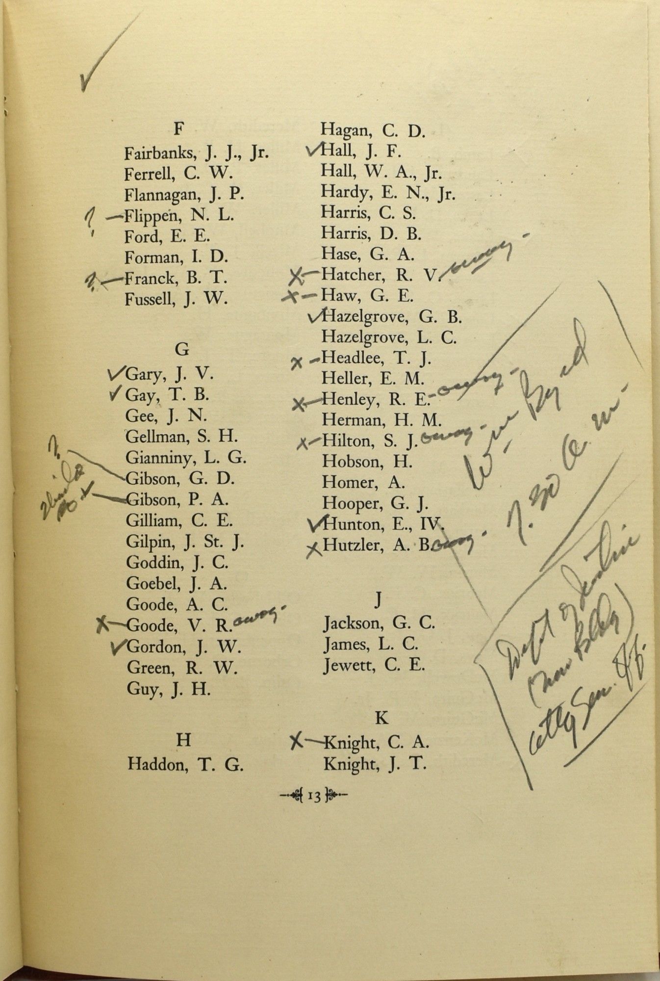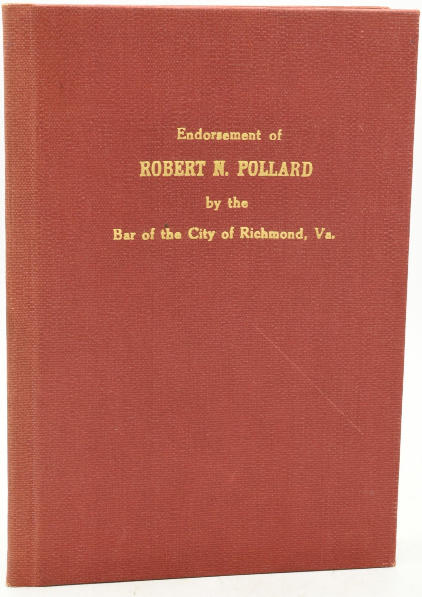 1935. Very Good binding. Pamphlet, now bound, produced by the Richmond Bar endorsing Robert N. Pollard for elevation as Judge of the District Court, Eastern District of Virginia. "Richmond is fortunate in having available for this responsible position the Honorable Robert N. Pollard, Judge of the Law and Equity Court of the City of Richmond". With a list of the member of the Richmond Bar, with some notes and check marks in Judge Pollard's hand, indicating efforts in lobbying for the position. Very Good binding.
