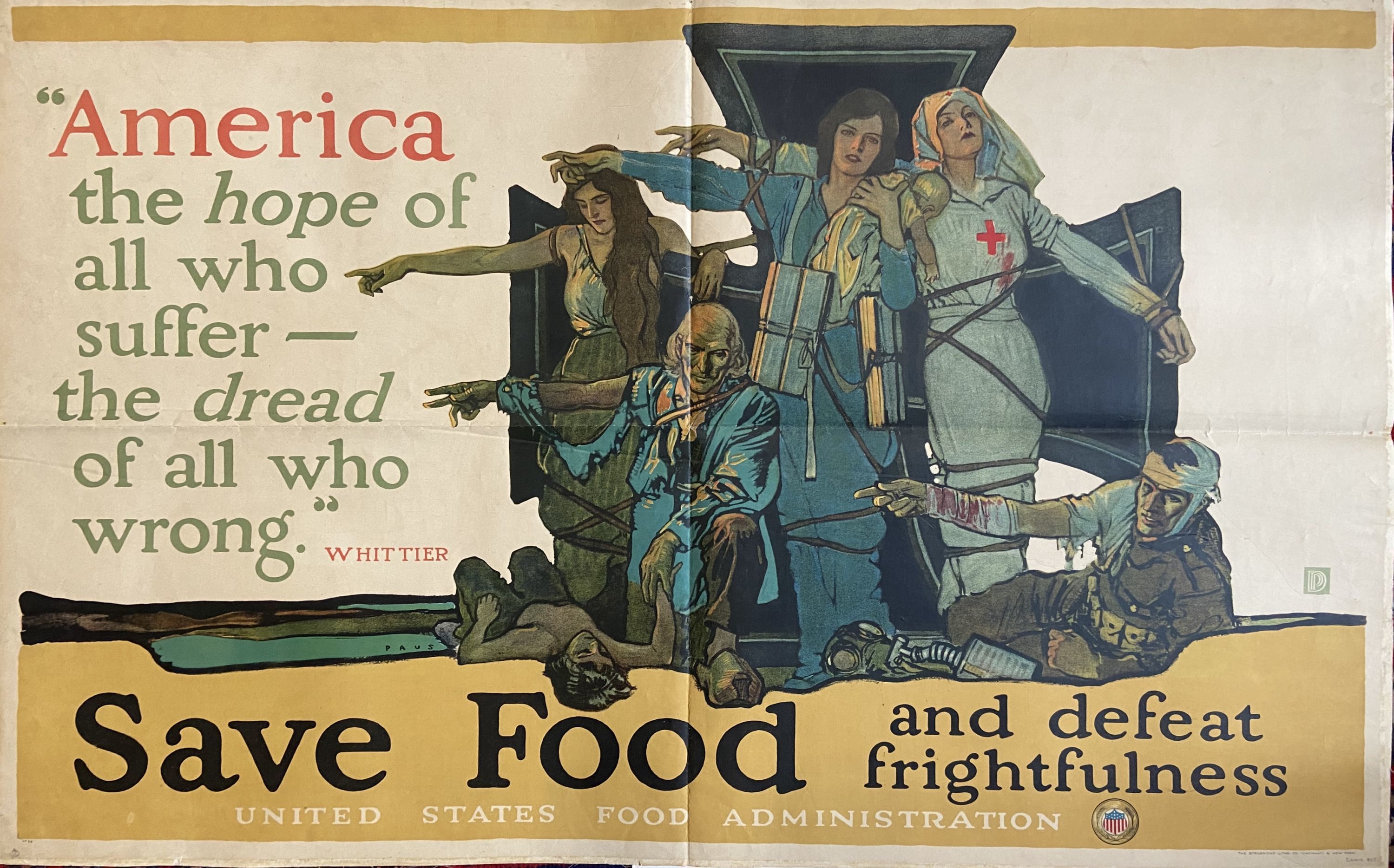 Homefront poster from World War I encouraging Americans to save food. This vividly colored lithograph depicts a Red Cross nurse, a wounded soldier, a mother and infant, and other people in need standing in front of a Iron Cross and pointing to a quote by John Greenleaf Whittier. Folded as issued, some cracks along folds. Repair to right margin. Mounted on linen. Beautiful colors.