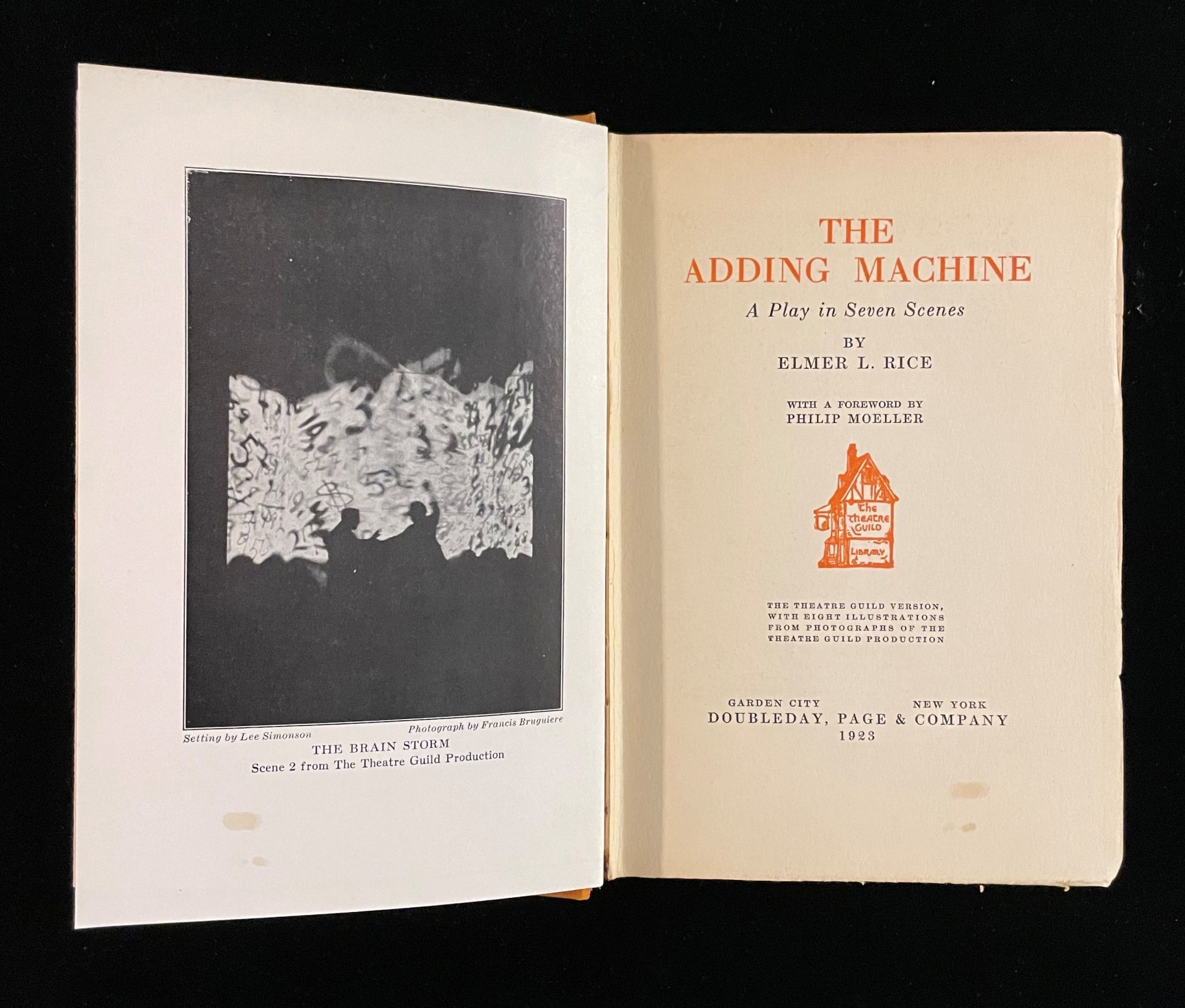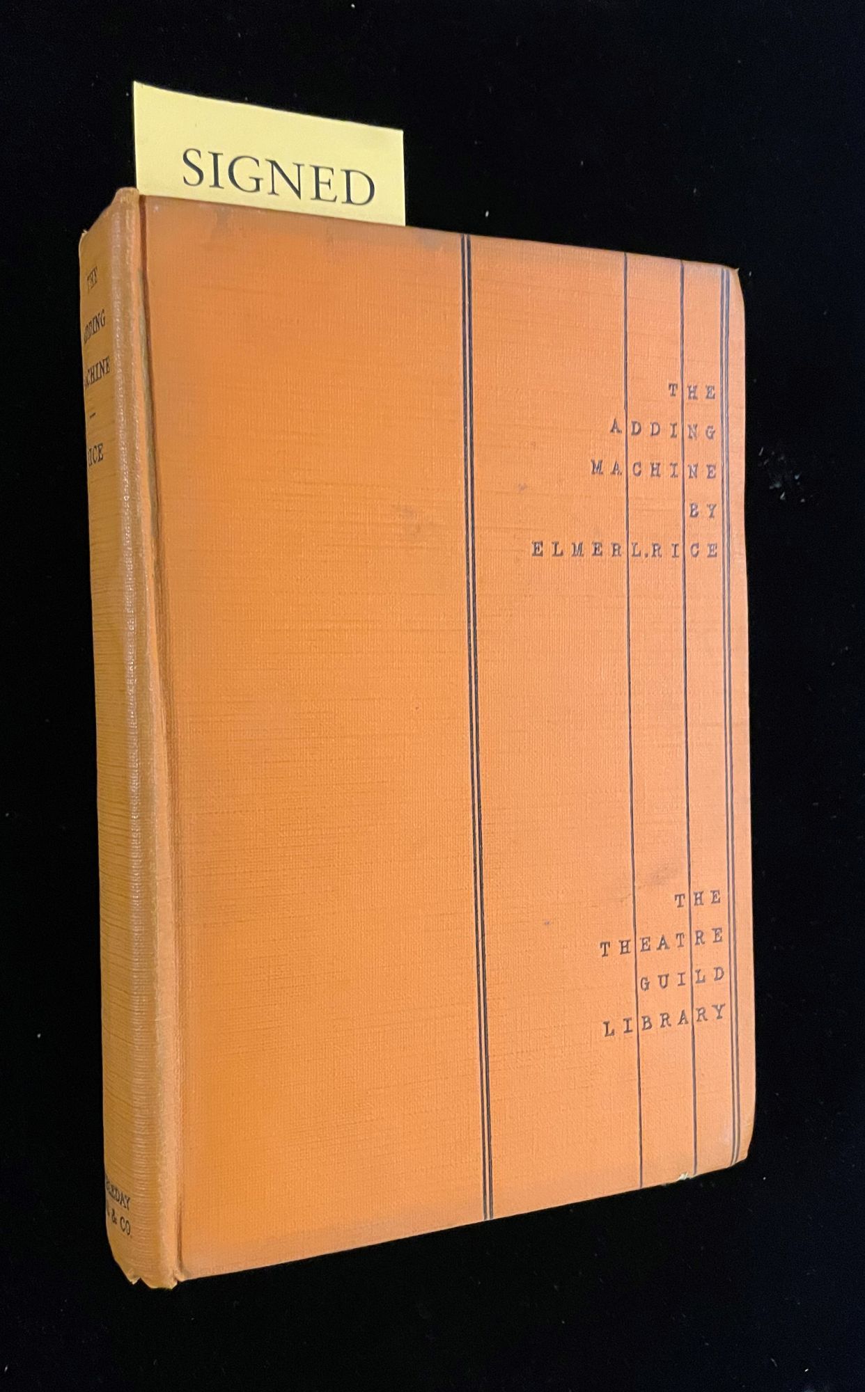 NY: Doubleday, 1923. Hardcover. Very Good. Rare signed first edition of socialist, Piulitzer Prize wiinning playwright Elmer Rice, inscribed on the ffe: "to Leonard L. Hess E. L. R. July 1923". Hess was a NYC author, whose short stories appeared in the American Mercury, Harper's Weekly, The Bookman and The Saturday Review mid-1920s-early 1930s. Rice was one of the founders of the Playwright's Company, along with Mazwell Anderson, Robert E. Sherwood, Kurt Weil and lawyer John F. Wharton 1938. The Adding Machine has been revived in recent years, this uncommon first edition of the play a production of The Theatre Guild. Orange cloth, black stamped titles, lacking dw. Covers soiled, mostly about edges and spine.
