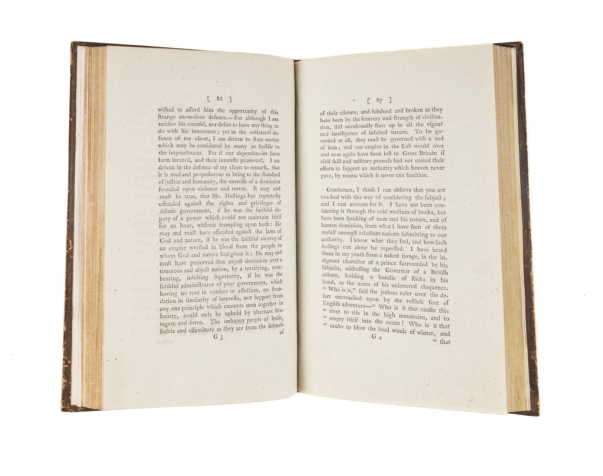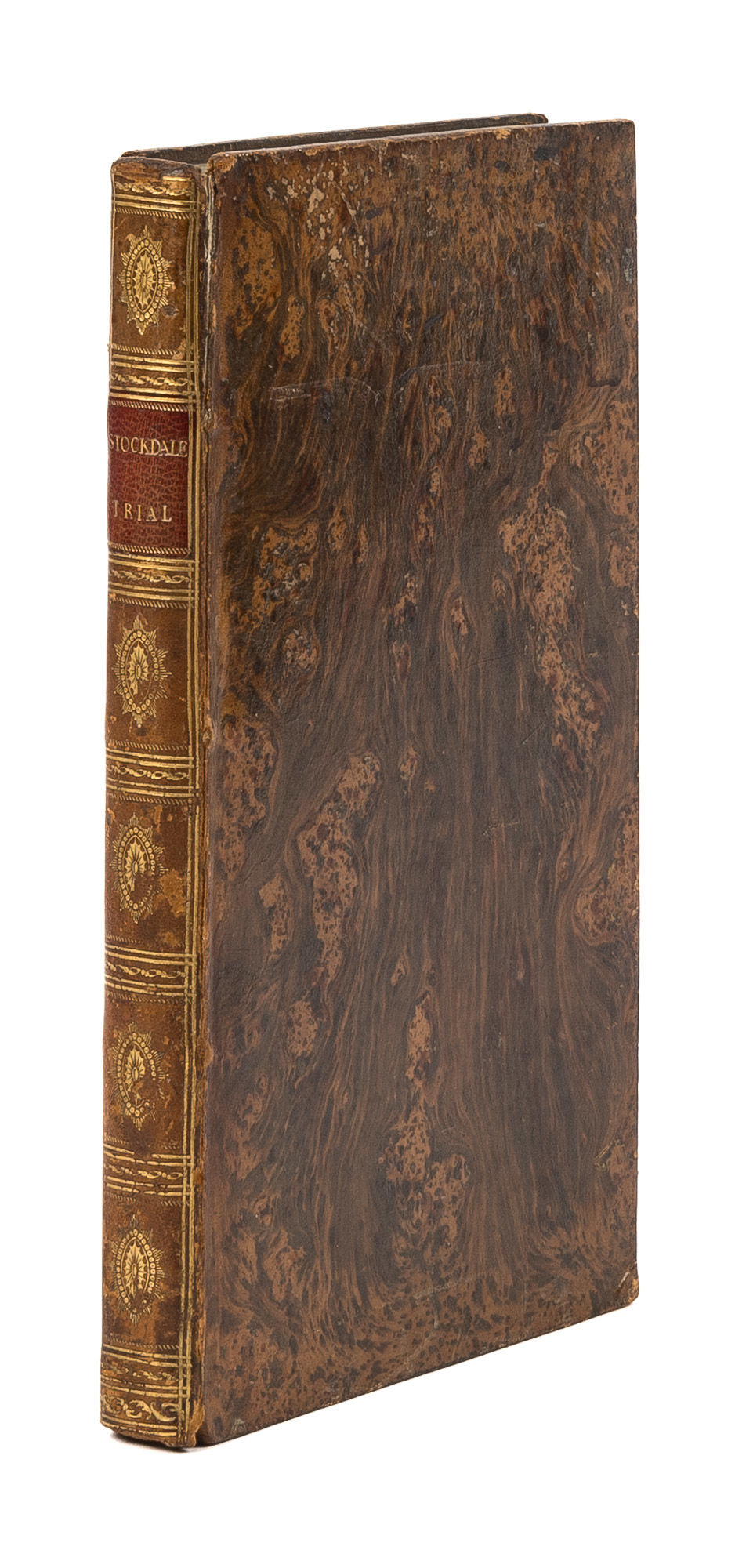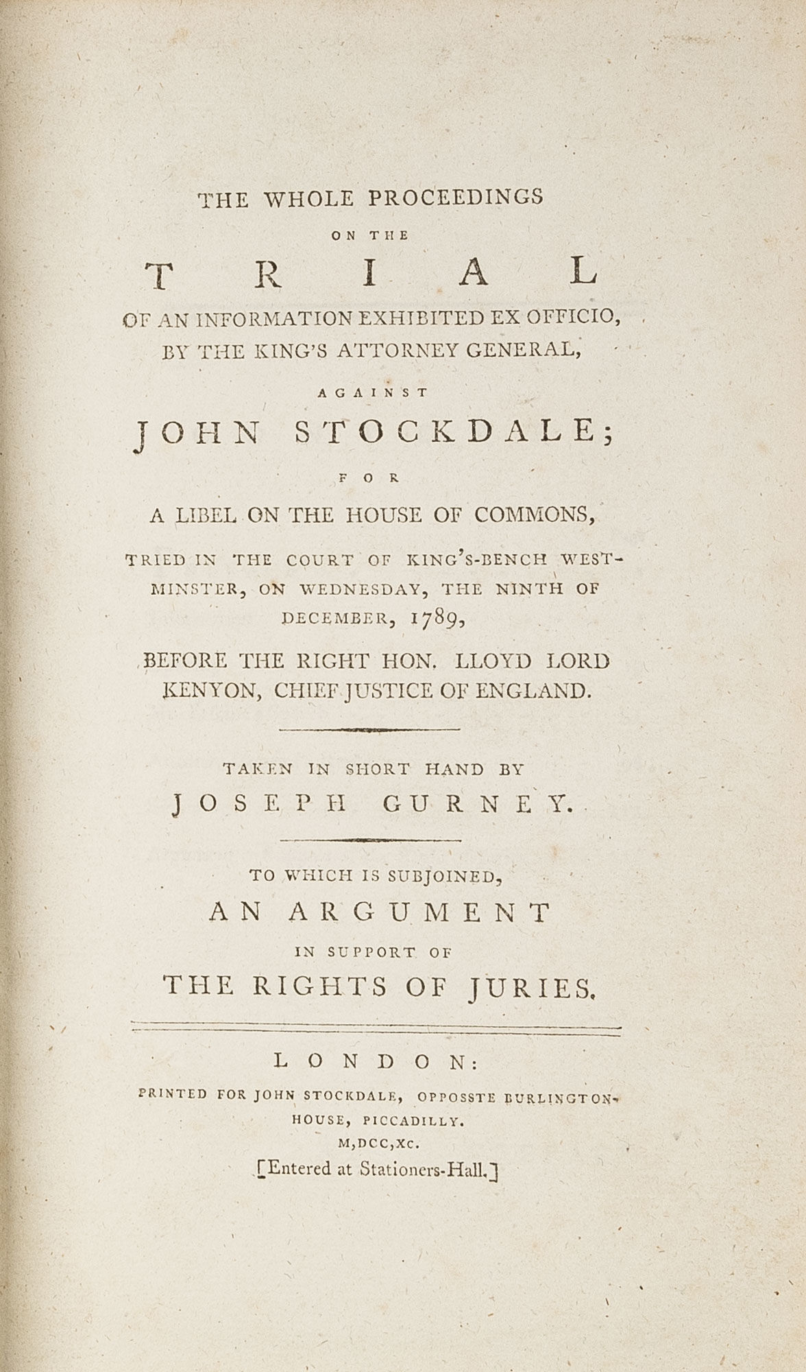 1790. London: Printed for John Stockdale, 1790. London: Printed for John Stockdale, 1790. A Case That Influenced the Passage of the Libel Act of 1792 [Trial]. Stockdale, John [1749?-1814], Defendant. Gurney, Joseph [1744-1815], Reporter. [Erskine, Thomas [1750-1823]. The Whole Proceedings on the Trial of an Information Exhibited Ex Officio, by the King's Attorney General, Against John Stockdale; For a Libel on the House of Commons, Tried in the Court of King's-Bench West-Minster, On Wednesday, The Ninth of December, 1789, Before the Right Hon. Lloyd Lord Kenyon, Chief Justice of England. Taken in Short Hand by Joseph Gurney. To Which is Subjoined, An Argument in Support of the Rights of Juries. London: Printed for John Stockdale, Opposite Burlington House, Piccadilly, 1790. xi, [1], 228 pp. Lacking final 8 leaves of publisher advertisements. Octavo (9-1/4" x 5-3/4"). Contemporary tree calf, gilt spine with lettering piece, gilt tooling to board edges, edges of text block colored yellow. Some minor nicks and scratches to boards, light rubbing to extremities, some wear to spine ends, joints starting at ends, corners bumped and lightly worn, hinges starting, light toning to text. An attractive, wide-margined copy in a lovely original binding. $1,000. * First edition. Stockdale, a publisher and bookseller, was indicted for libel on the House of Commons after publishing an account of the impeachment of Warren Hastings by John Logan that accused the Commons of corrupt and unjust behavior. Stockdale was defended by Erskine, who argued that Stockdale should not be judged by isolated passages in Logan's book, but by the entire publication. Stockdale was acquitted and his case is believed to have influenced the passage of the Libel Act of 1792, which restored the verdict power of juries in libel cases. Taken in shorthand by Gurney, The Whole Proceedings is Stockdale's account of his trial. A Dublin reissue and a "New" London edition were also published in 1790. English Short-Title Catalogue T83638.