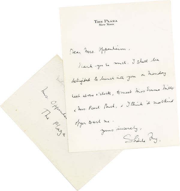 New York: John Day Company, [1932]. First Trade Edition. Octavo (21cm.); publisher's brown cloth in yellow and red decorative dust jacket, red topstain; [6],467pp.; pictorial endpapers printed in red. Crown gently nudged, some pinpoint wear to gilt titling on spine, else Near Fine. Dustjacket is unclipped (priced $2.50), gently spine-sunned and lightly dusty, with light wear to extremities, and a few closed tears along upper edge; Very Good+. Inscribed and signed on front flyleaf: "For Mrs. Oppenheim / Pearl S. Buck." Addtionally laid in are several pieces of ephemera and correspondence from the office of Laurent Oppenheim, including two sheet of pencil notes on Plaza Hotel notepaper, beginning with the mention of "Pearl Buck -Radio - Feb 20"; a mimeographed postcard announcing the opening of the Family Planning Center by the American Birth Control League at 701 Fifth Avenue; and an autograph note, signed, to Oppenheim from a Sheila Fry (?), thanking her for an invitation to lunch at which she was to be introduced to Buck. Provenance: Inscribed to philanthropist Mrs. Laurent Oppenheim (1878-1955), née Amy Ruth Schwartz, founder of the School Art League in New York City.
