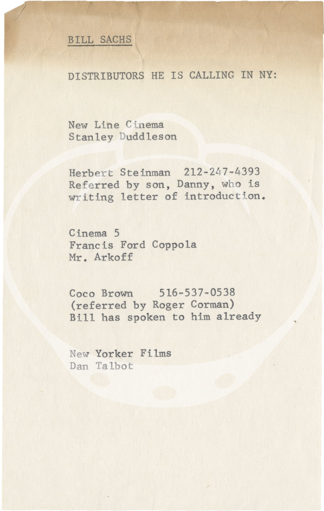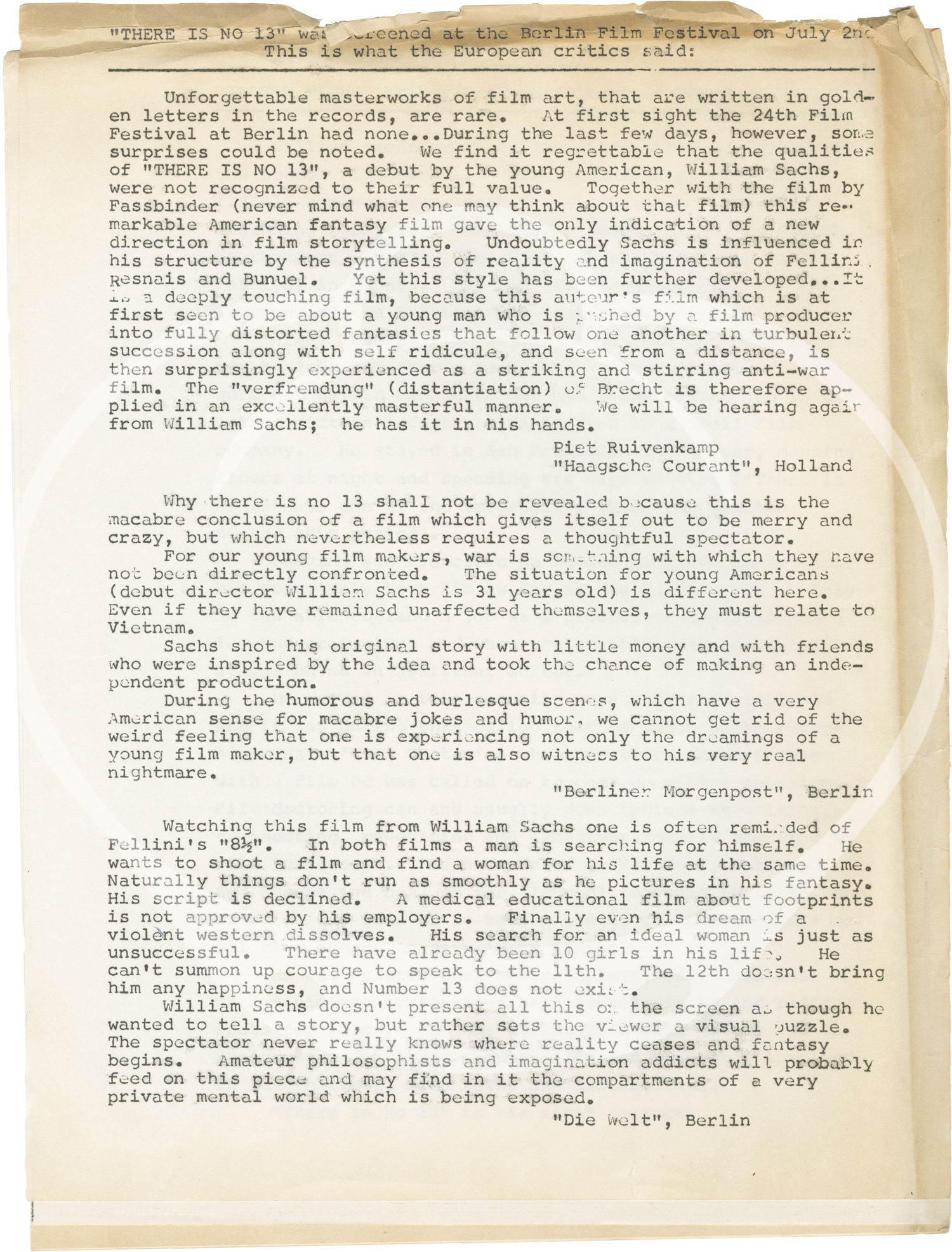 N.p.: N.p., 1970. Draft script for an unproduced film. Laid in with the script are seven copies of a page of reviews for screenwriter William Sach's film "There is No 13" (1974), as well as a small typed list labeled "BILL SACHS / DISTRIBUTORS HE IS CALLING IN NY."