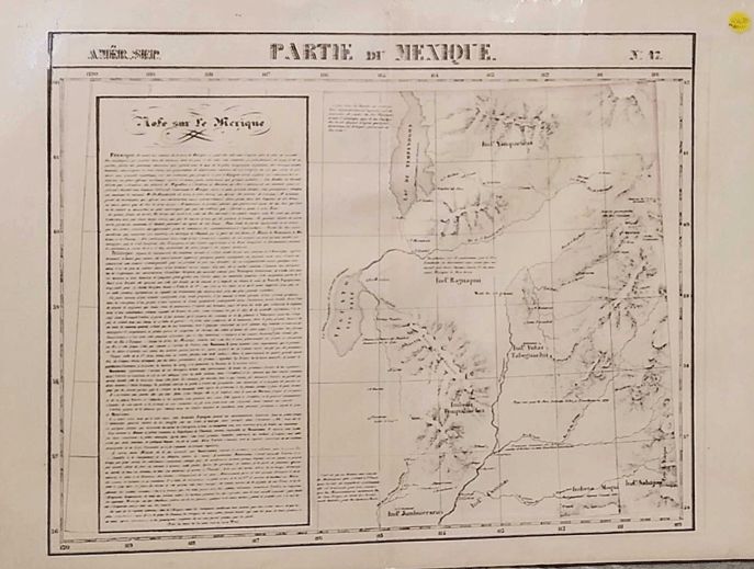 [Brussels], 1827. Map. 27 inches by 21 inches. Some closed tearing along the center fold line. Moffat, 3. An early view of Utah, with information from Miera including Lac de Timpanogos (Uintah Mountains), and Rio de Sn. Buenaventura (Green River) flowing WSW into Teguayo Lac Sale (Sevier Lake). Shows the route of the Dominguez-Escalante expedition. Interestingly, a note supposing northern Utah to be the ancestral homeland of the Aztecs is included.