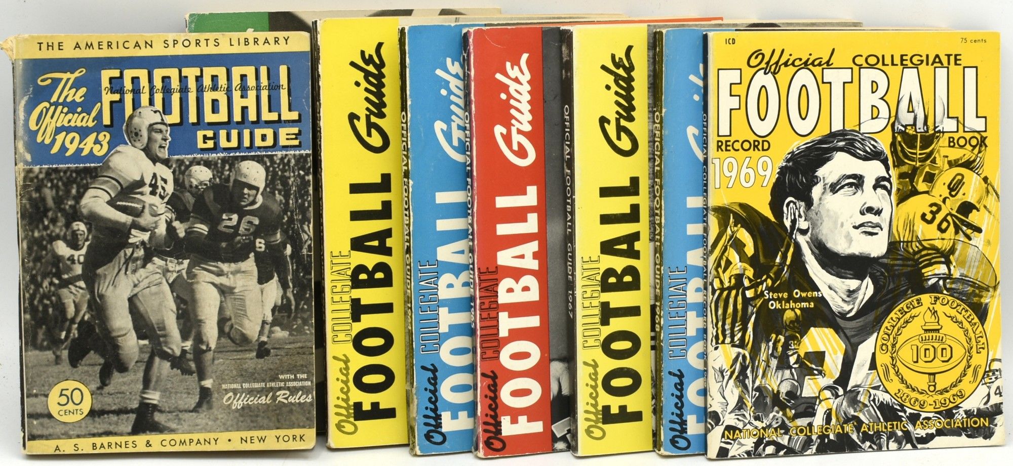 [MAGAZINE COLLECTION] EIGHT VARIOUS FOOTBALL GUIDES FROM 1943 TO 1969. THE AMERICAN SPORTS LIBRARY. THE OFFICIAL NATIONAL COLLEGIATE ATHLETIC ASSOCIATION FOOTBALL GUIDE INCLUDING THE OFFICIAL RULES 1943; 1962; 1963; 1964; 1965; 1967; 1968; 1969