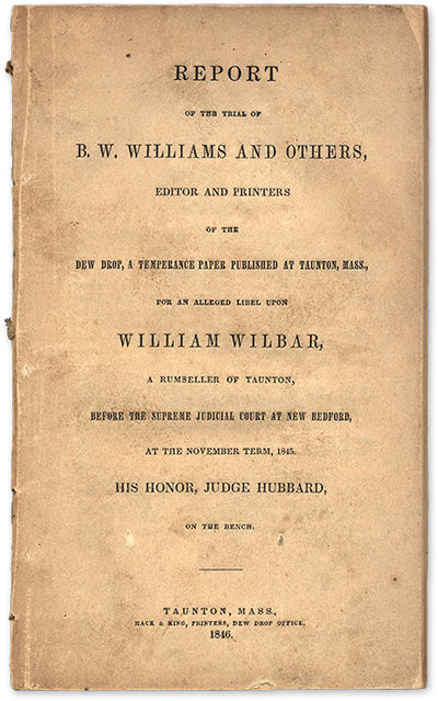 1846. Taunton, Mass., 1846. Verdict Not Guilty. Taunton, Mass., 1846. Verdict Not Guilty. "A House of Human Slaughter" [Trial]. Williams, B[enjamin] W., Principal Defendant. Report of the Trial of B.W. Williams and Others, Editors and Printers of the Dew Drop, A Temperance Paper Published at Taunton, Mass., For an Alleged Libel Upon William Wilbar, A Rumseller of Taunton, Before the Supreme Judicial Court at New Bedford, At the November Term, 1845, His Honor, Judge Hubbard, on the Bench. Taunton [Mass.]: Hack & King, Printers, Dew Drop Office, 1846. 60 pp. Octavo (8-1/2" x 5-1/4"). Disbound stab stitched pamphlet. Moderate toning, light soiling to exterior, some rubbing to extremities. Light browning to text, faint tick marks in light pencil to margins in a few places, light foxing to a few leaves. $450. * First edition. In January, 1845, the defendant published an article in his temperance paper The Dew Drop that referred to Mr. Wilbar as "the incarnate Devil" with a mouth that emitted "flames of fire" that "withered and scorched all the deluded wretches" who entered his shop, "a house of human slaughter." The defendants were acquitted after 45 minutes of deliberation. Although there are many reprint editions available, the original 1846 printing is scarce in the marketplace. OCLC locates 7 copies in North American law libraries (Harvard, Library of Congress, Social Law, University of Minnesota, University of Missouri, University of Pennsylvania, York University). Not in McCoy, Freedom of the Press. Cohen, Bibliography of Early American Law 12078.