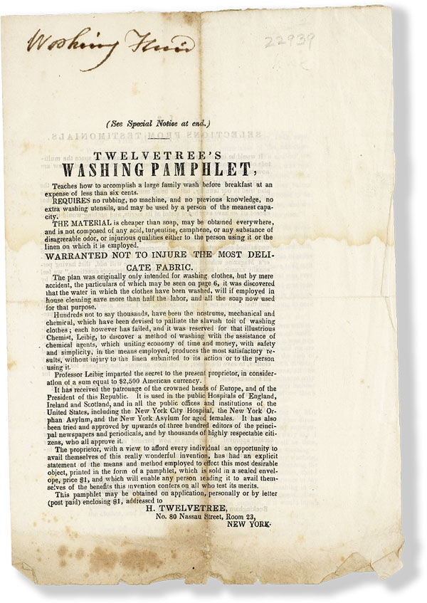 New York: H. Twelvetree, [1850]. First Edition. Octavo bifolium (ca. 24cm.); darkening along previous folds, dampstaining most heavily along bottom margin, contemporary manuscript note to upper panel, else Good or better overall. Advertising circular for Twelvetree's secret washing material which "REQUIRES no rubbing, no machine, and no previous knowledge, no extra washing utensils, and may be used by a person of the meanest capacity" (p. [1]). Testimonials boast the "London Times," "The Mother's Magazine," and Maria Gaspard, Chief Laundress in the House of Her Majesty, Queen Victoria: "after considerable hesitation your plan of washing was tested on some articles of Her Majesty's clothing, the result was most satisfactory. The process and specimens of the washing have been submitted to Her Majesty, and meet her decided approval" (p. [2]). OCLC locates two copies as of March, 2020, at the AAS and U. Michigan.