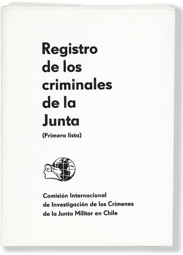 [Helsinki: Comisión Internacional para la Investigación de los Crímenes de la Junta Militar en Chile, n.d., ca. 1974. First Edition. Octavo; [42] leaves printed on rectos only loosely housed as issued in cream printed card chemise. Light wear to chemise extremities, else Fine. List of forty-two members of the Chilean junta, beginning with Pinochet and his top officials, after which proceding alphabetically from Luis Alarcón Gacitua to Luis Vidal, providing a list of crimes committed during the regime. Though described as the first such list, this appears to be complete and all published. We find no copies separately catalogued in OCLC as of March, 2020.