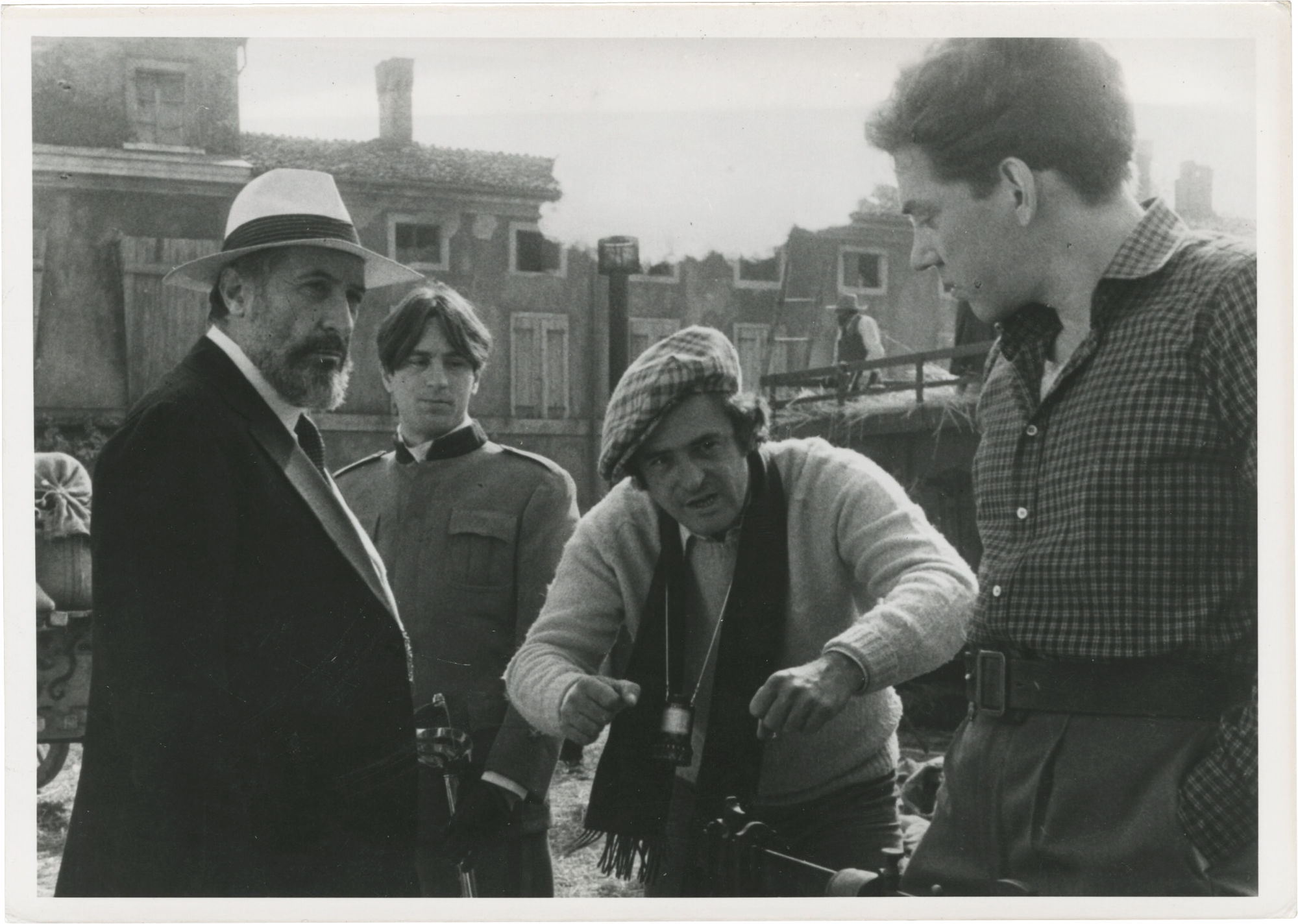 Los Angeles: Paramount Pictures, 1976. Vintage photograph on the set of the 1976 film, showing director Bernardo Bertolucci giving instructions to actors Robert De Niro, Gerard Depardieu, and Romolo Valli.