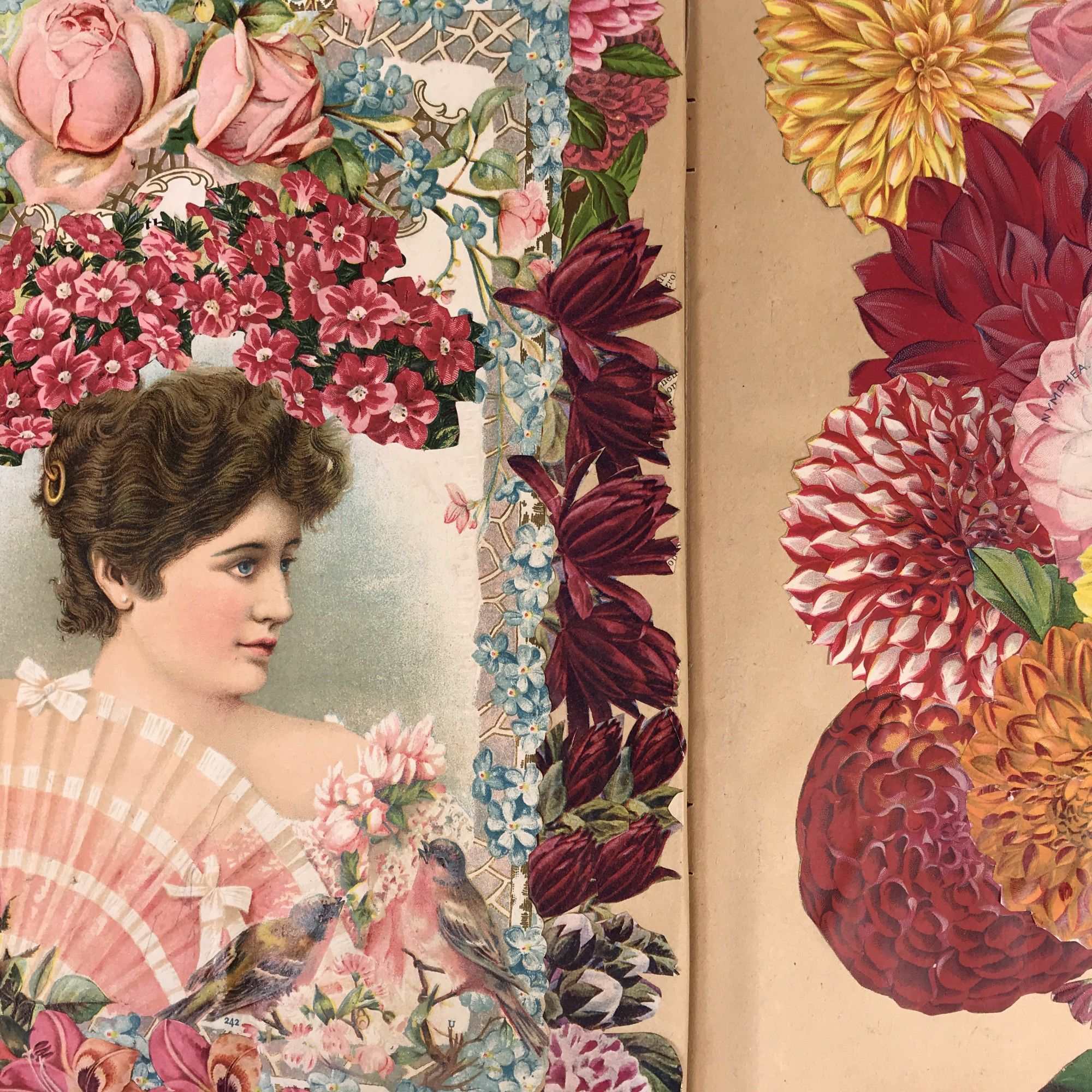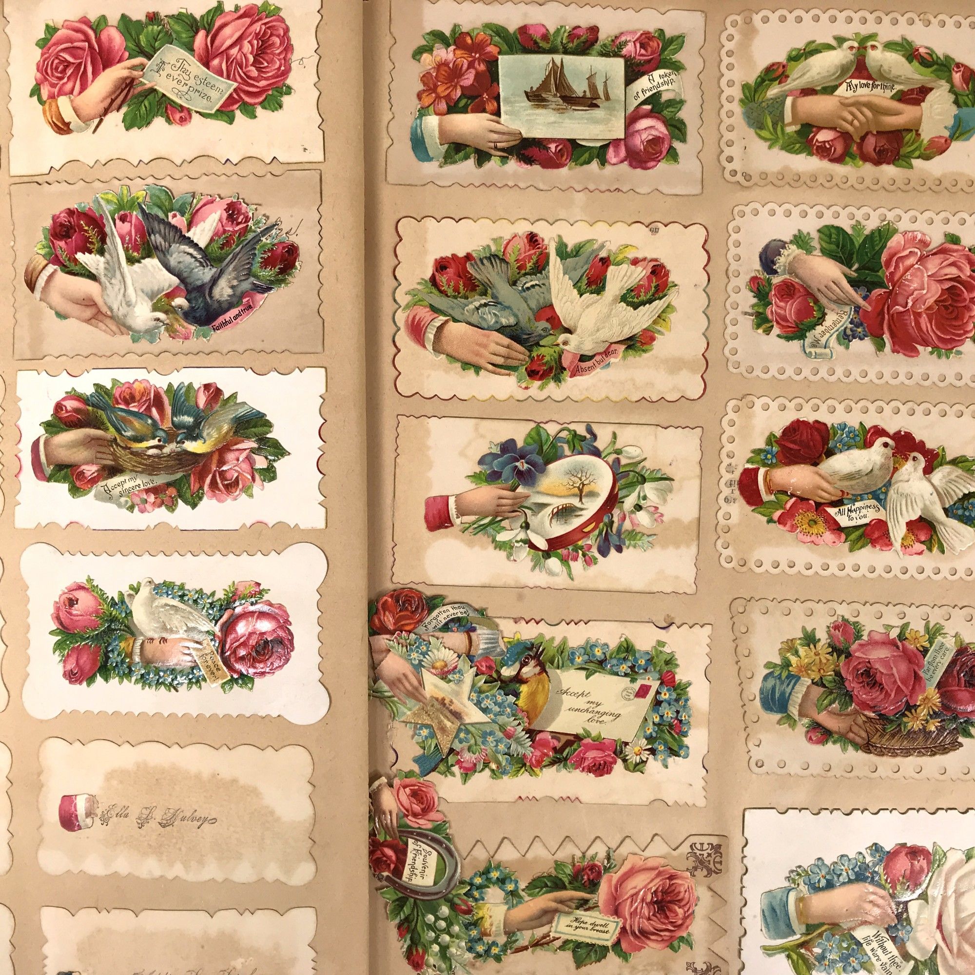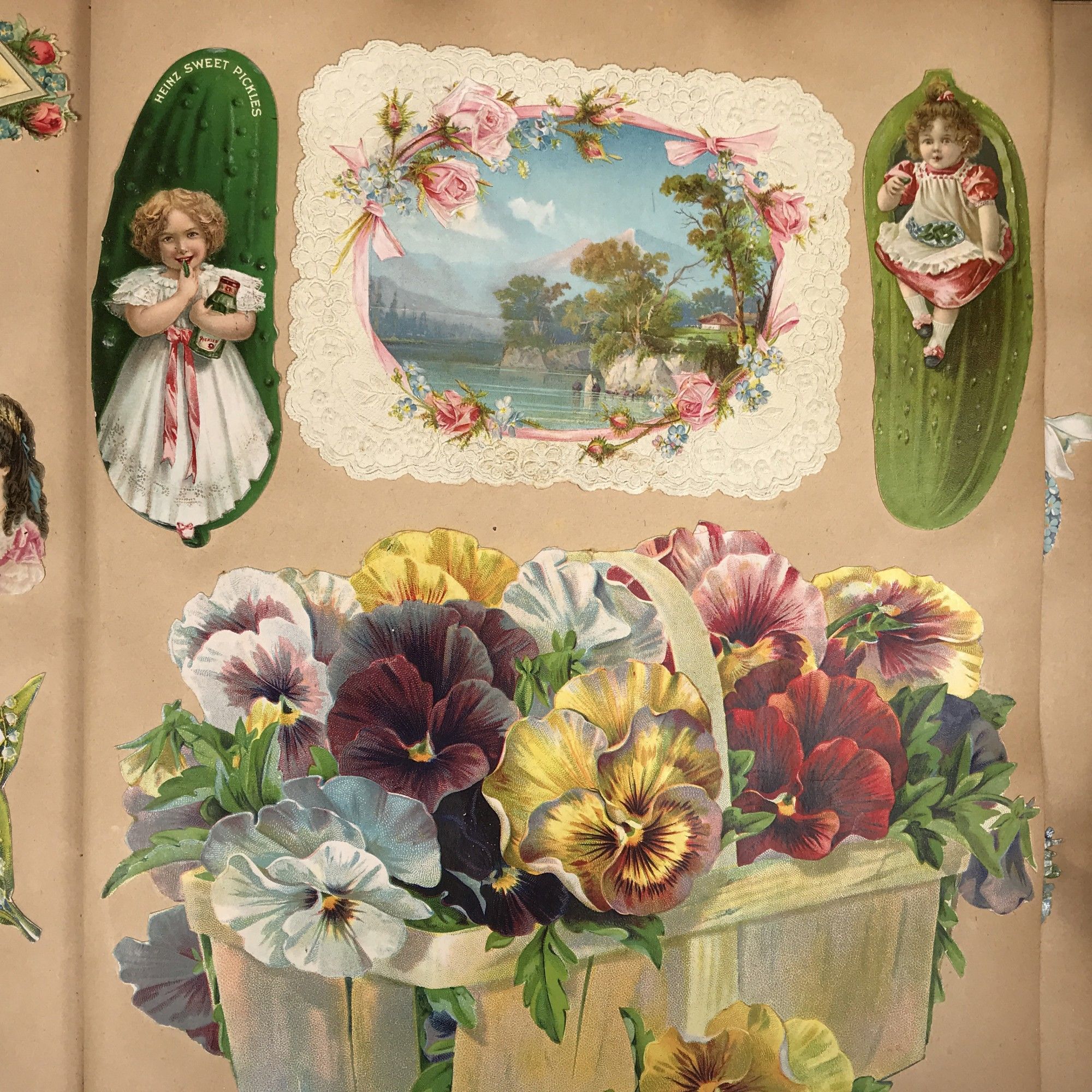 A substantial scrapbook from the late 19th century, packed with chromolithographed advertising cards, die-cuts, and other pretty Victorian items. There are about 26 leaves -- measuring 13 12 x 10 12" -- with each side covered with cards. There are many "lift the flap" friendship cards, with printed names underneath. One of the nicest of its kind we've seen, with many of the die-cuts filling the pages.