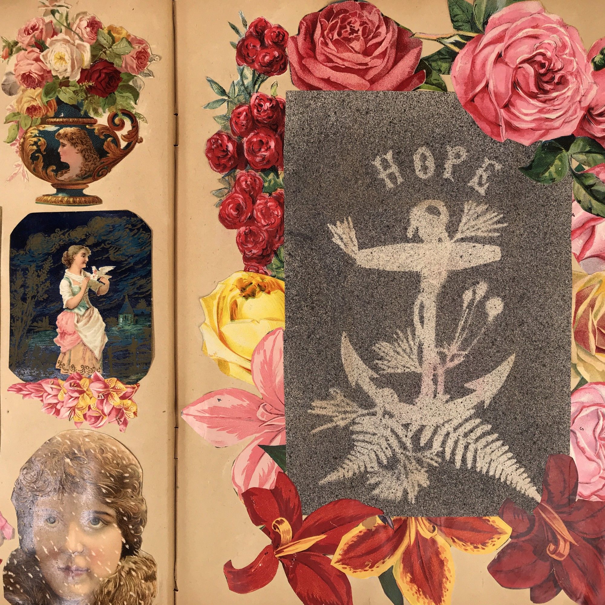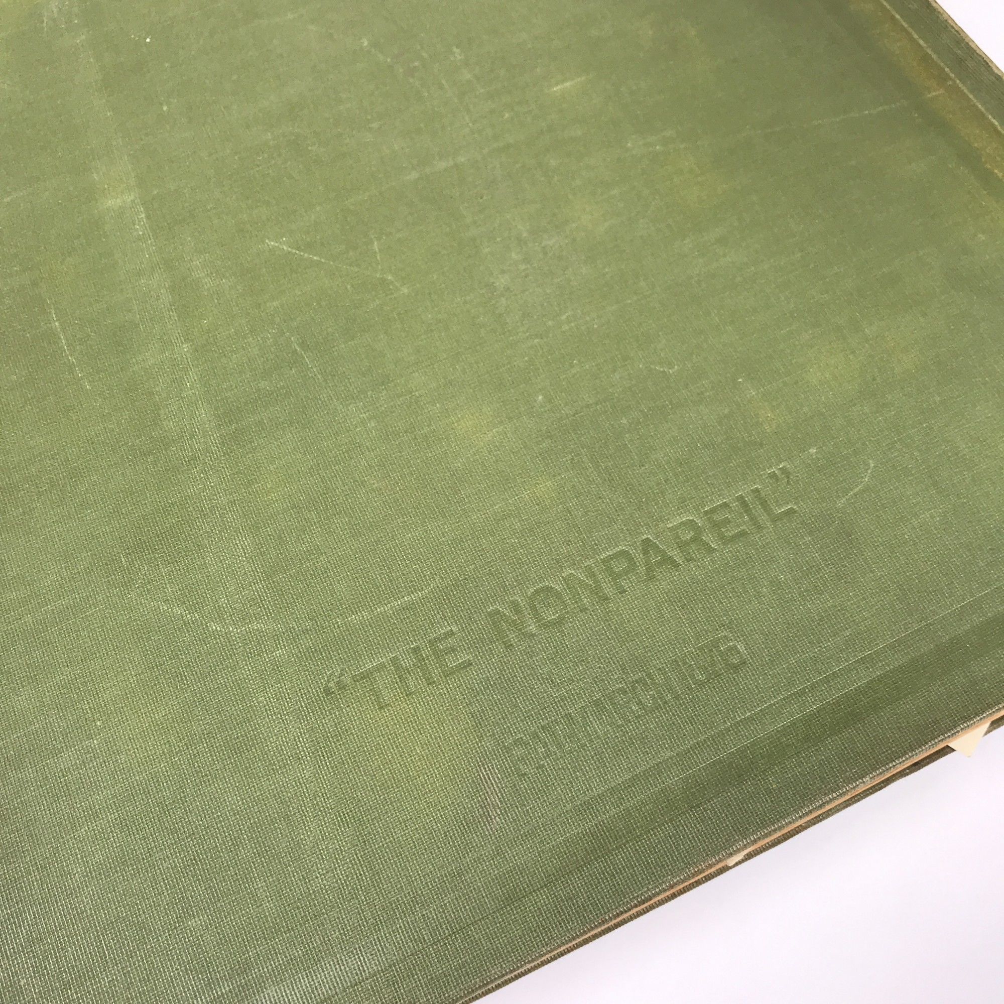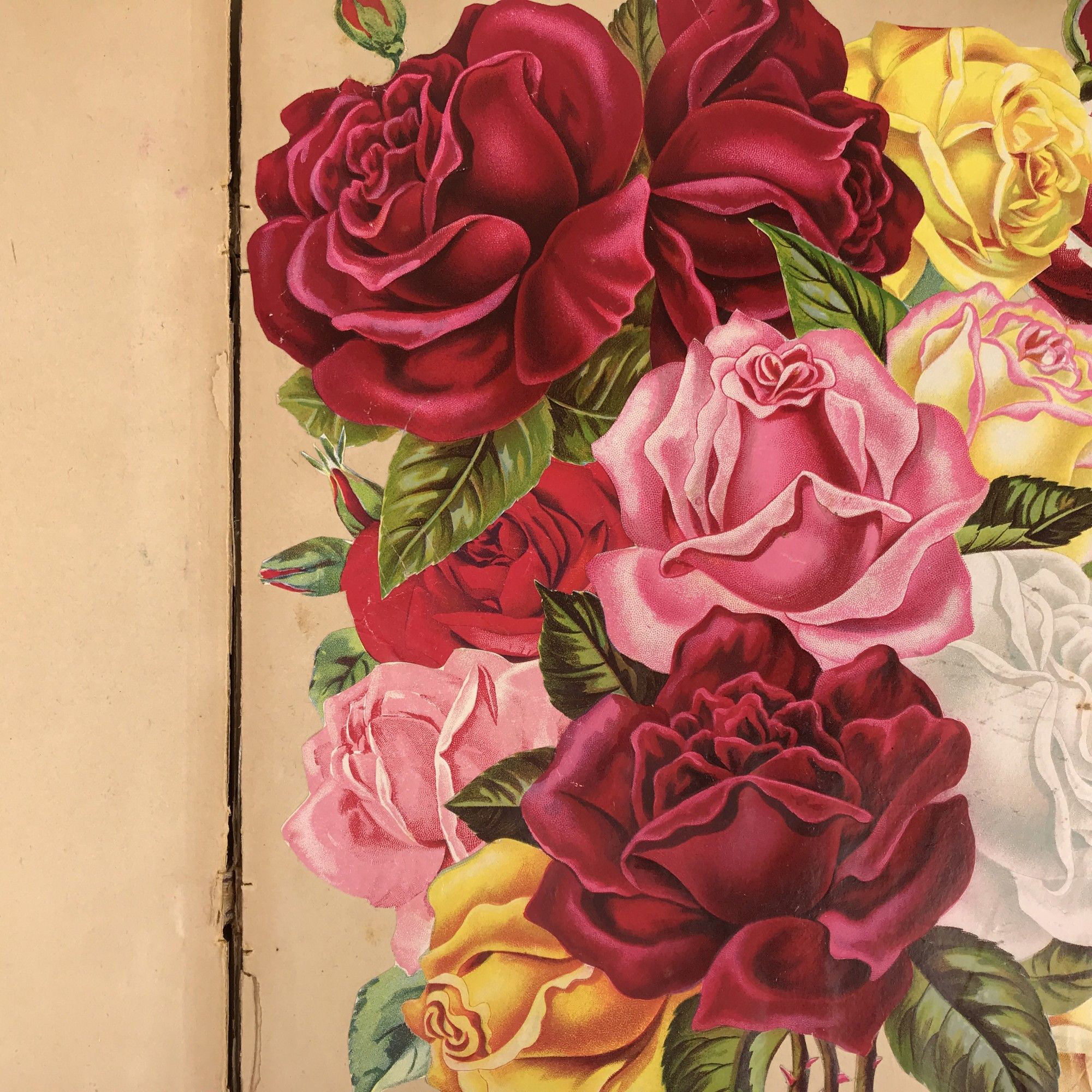 A substantial scrapbook from the late 19th century, packed with chromolithographed advertising cards, die-cuts, and other pretty Victorian items. There are about 26 leaves -- measuring 13 12 x 10 12" -- with each side covered with cards. There are many "lift the flap" friendship cards, with printed names underneath. One of the nicest of its kind we've seen, with many of the die-cuts filling the pages.