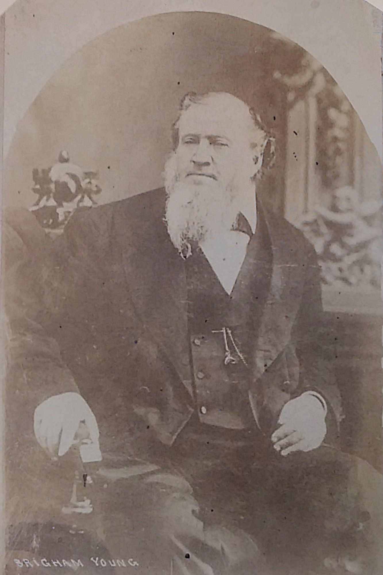 Wasatch Block, Salt Lake City, Utah: Junius Young Photographer. Very good. A handsome photograph [10.5 cm x 16.5 cm] of Brigham Young seated, and looking quite relaxed. Tan mount. Junius Young backstamp. Top corners of mount clipped. Tape stain to the reverse. Brigham Young looking quite debonnaire.
