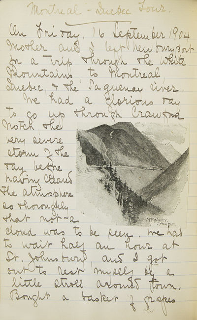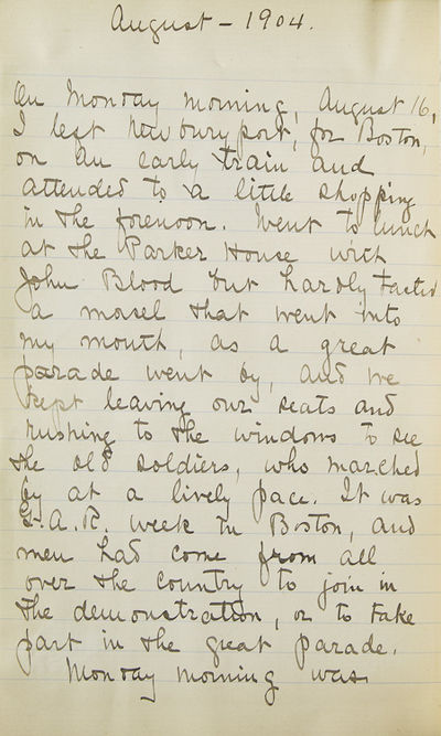 Manuscript Diary covering Trips to Bermuda (146 pp., Janurary 4-April 24, 1901), the South [i.e. Charleston, St. Augustine and Washington, D.C., Dec 22, 1903-June 8, 1904, 125 pp.], Description of the Grand Parade in Boston of the Grand Army of the Republic (14 pp., August 16-17, 1904); Trip to Quebec and Montreal (50 pp., Sept. 16-28, 1904)