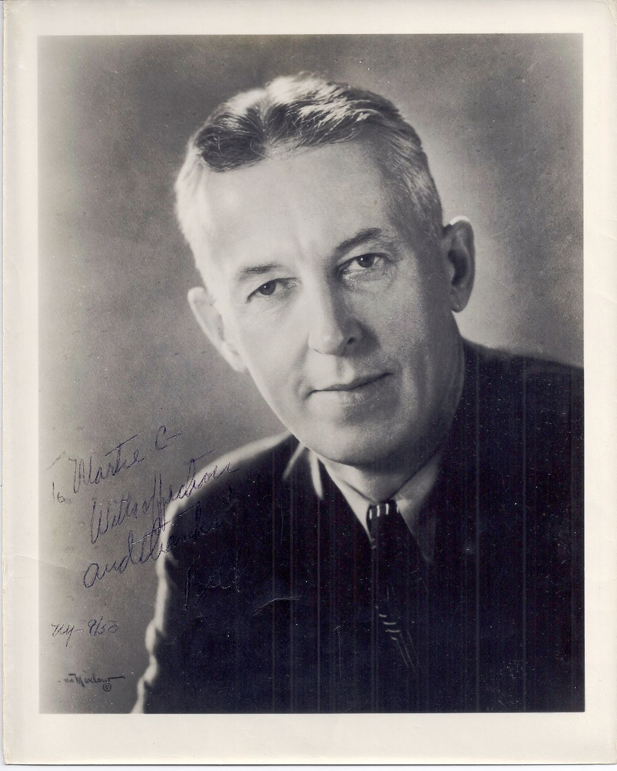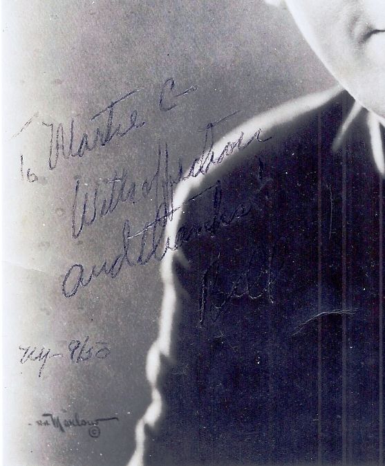New York, 1950. Minor surface wear, ink light at a few points with "Bill" on the dark portion of his suit but still visible. Near Fine. A scarce 8" x 10" Black-and-White Formal Photograph SIGNED by Bill Wilson: "To Martie C--/With affection/and thanks/Bill/NY -- 9/50."