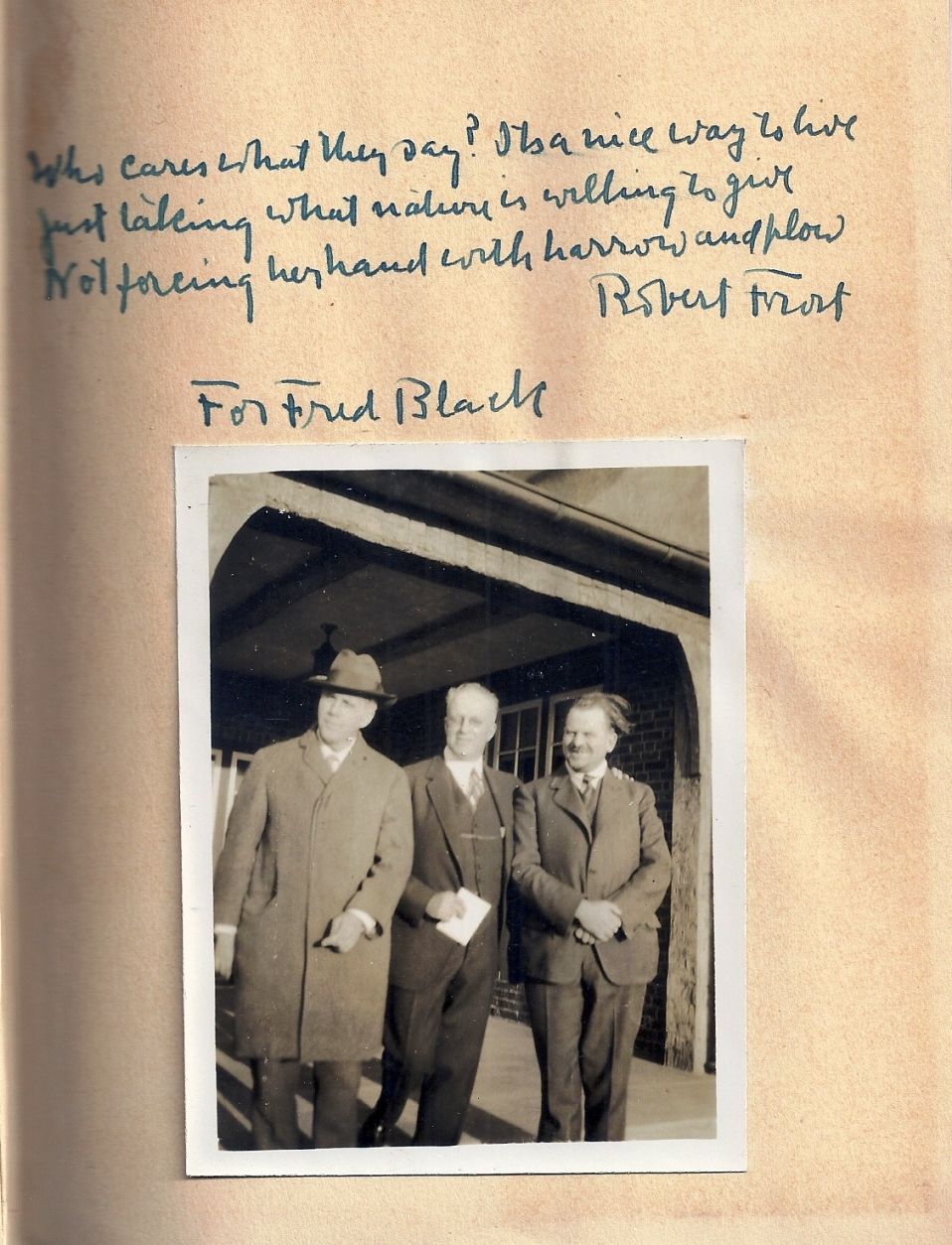 New York: Henry Holt and Company, (Dec. 1925). Second Edition. Hardcover. Evidence of removal of bookplate on the front pastedown; light edgewear. Near Fine, lacking the dustwrapper. Cloth-backed boards. Later Printing (December 1925) of Frost's second book. Portrait frontispiece of the author. SIGNED by the poet on the front endpaper with a three-line stanza from a poem in the book "Blueberries": "Who cares what they say? It's a nice way to live/Just taking what Nature is willing to give/Not forcing her hand with harrow and plow/Robert Frost/For Fred Black." A small (3-3/8" x 4-3/8") original photograph of Frost in a suit standing with two other men is tipped to the front endpaper below the inscription. Fred Black was editor of Henry Ford's DEARBORN INDEPENDENT.