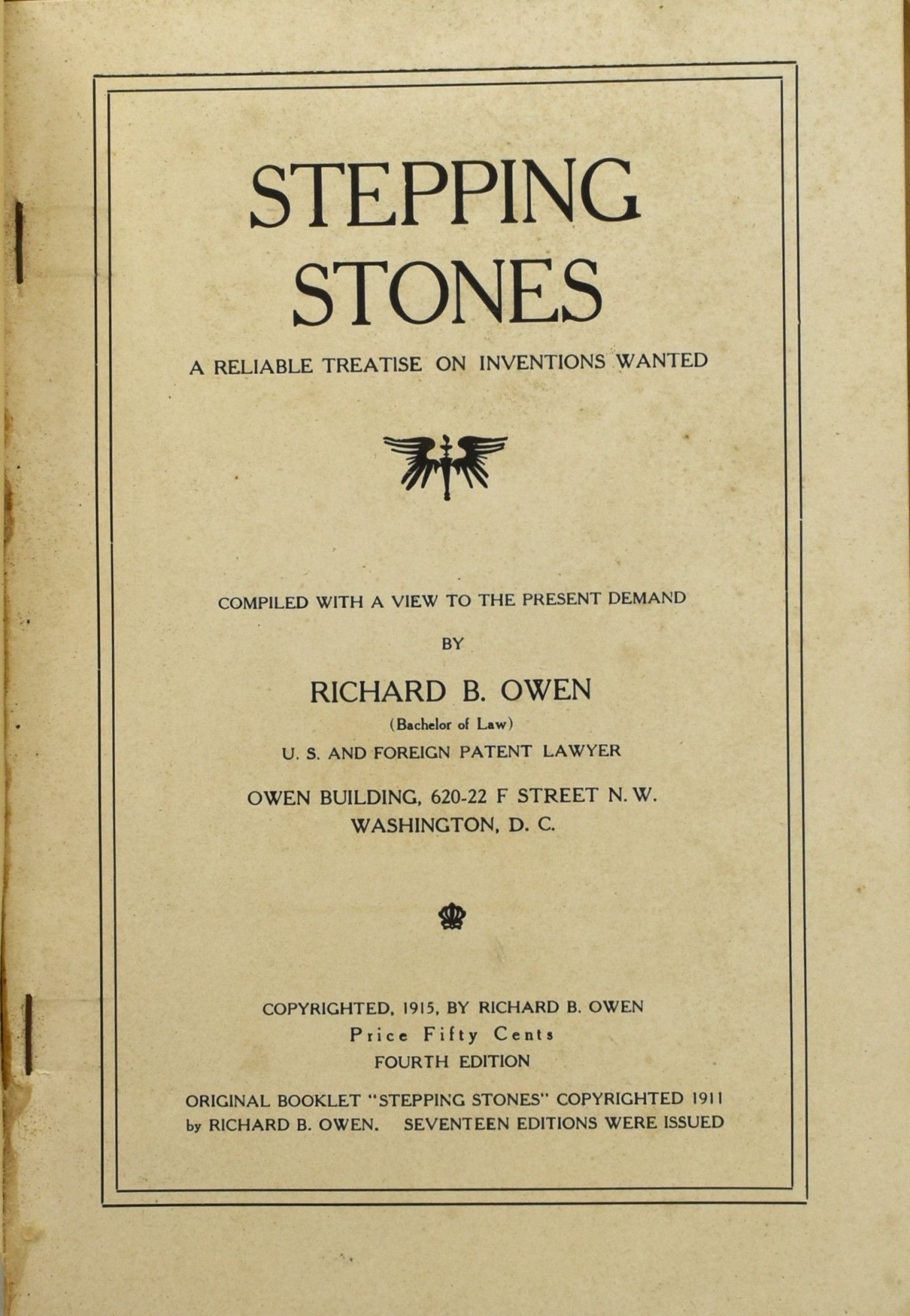 Richard B. Owen, 1915. Fourth Edition. Soft Cover. Good binding. A call to arms for the American inventor! First published in 1911, this being the fourth edition. A booklet with lists and descriptions of various items in need of invention, including but certainly not limited to the self-threading needle, quieter typewriters, a cheaper vacuum, and a perpetual motion machine. "Many noted authorities agree that the secret of perpetual motion will be discovered sooner or later. Personally, I have the greatest faith in the American inventor." (p. 60). General ideas for invention are organized by subject, including Army, Chemistry, Mail Order Goods, Farm and Dairy, etc. Small chips and creasing to the edges of the covers. Tan paper wrappers, with gilt lettering and design. OCLC notes two institutional holdings of any edition. Good binding.