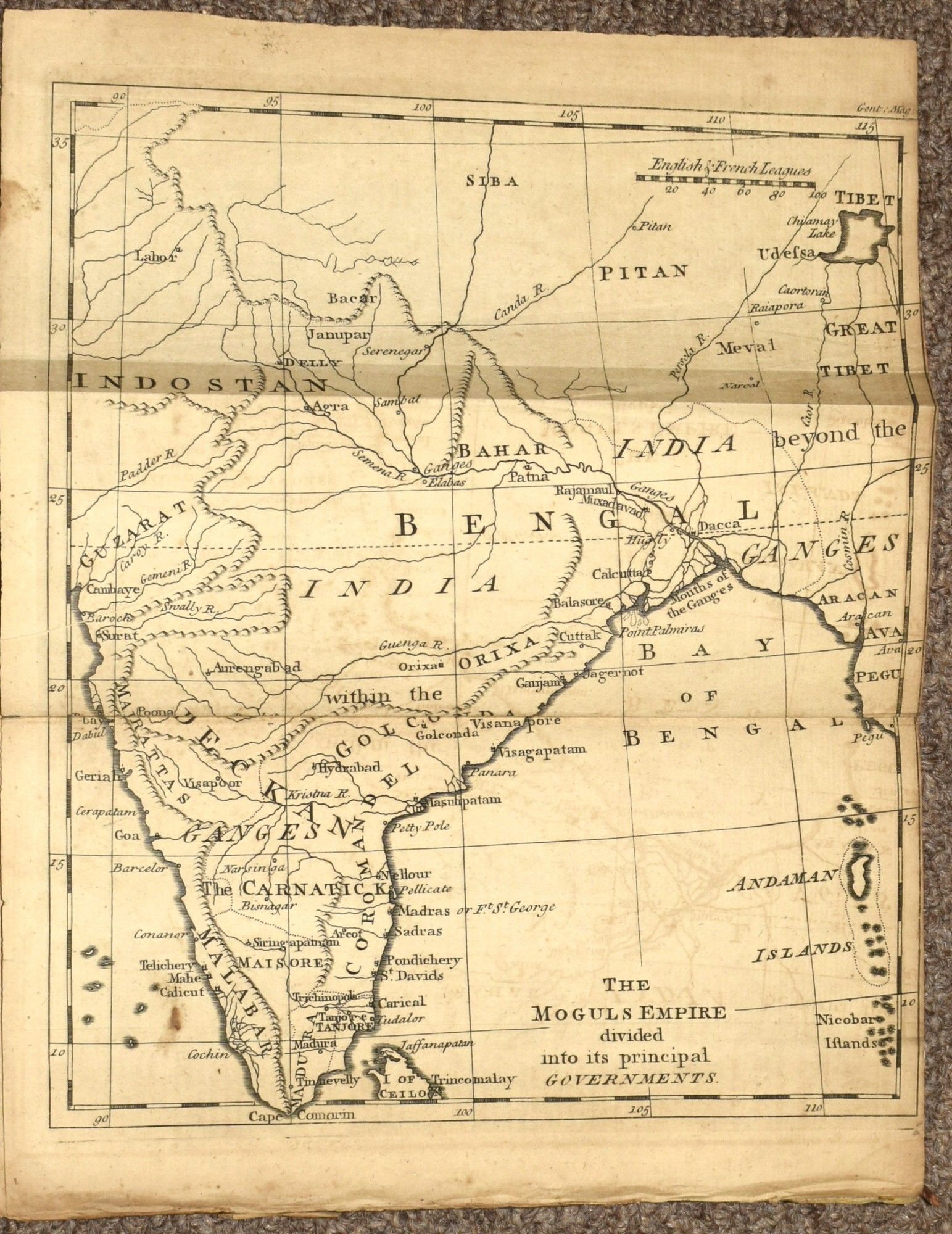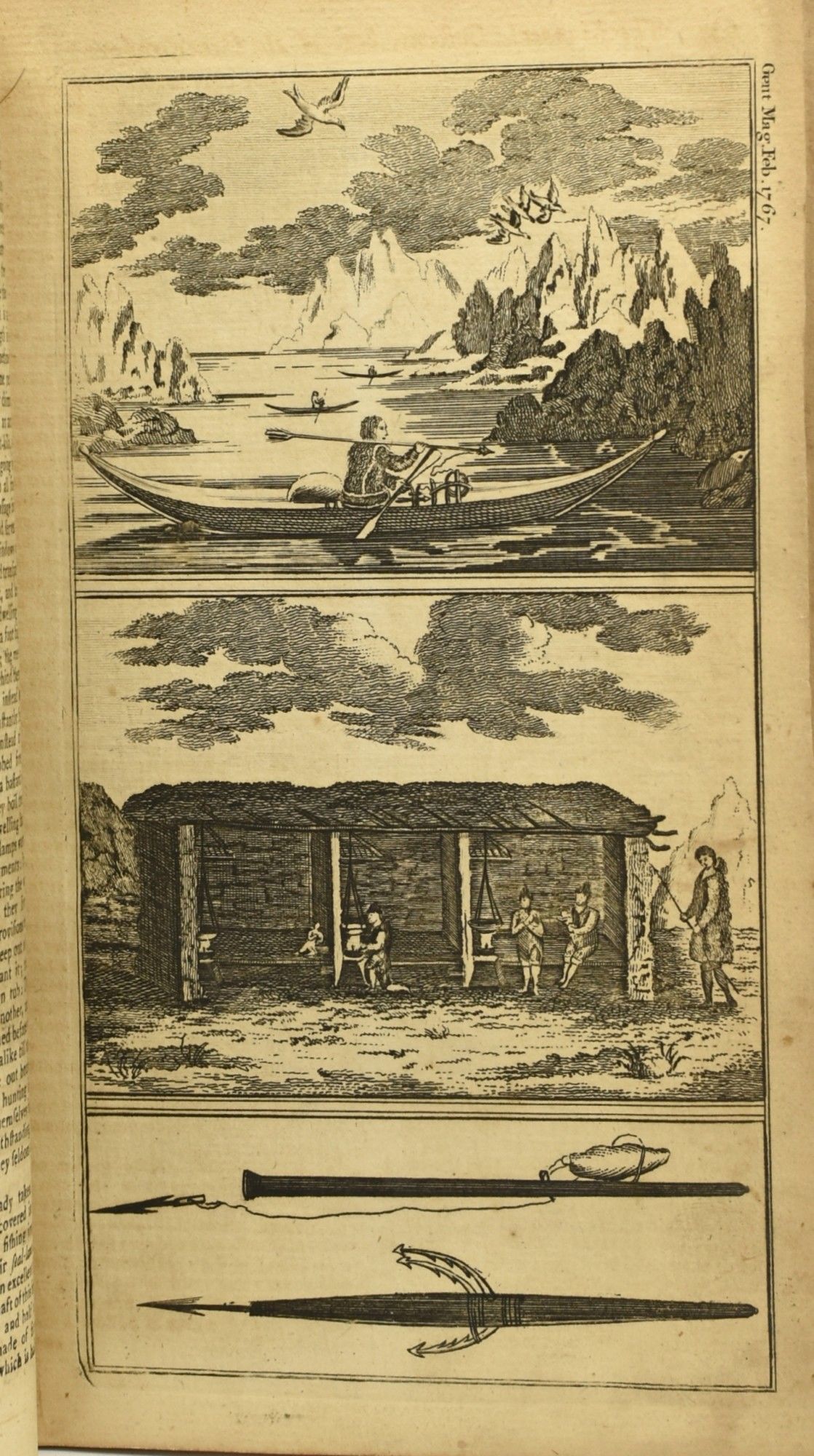 London: Printed by D. Henry at St. John's Gate, 1767. Disbound. Fair binding. A monthly magazine, founded in 1731, this being the February 1767 issue. With an account of travel to Greenland and a study of its culture, studies on blight-preventing insects, 'the phaenomenon of spiders,' the 'danger from a too liberal use of nutmegs,' and the usual pieces of poetry and literary criticism. Two engraved plates, and a folding map of India at the rear, of the time of the Mogul Empire. Engraved text illustrations. Disbound; lacking front and rear covers though spine sewing is holding together reasonably well. Fair binding.