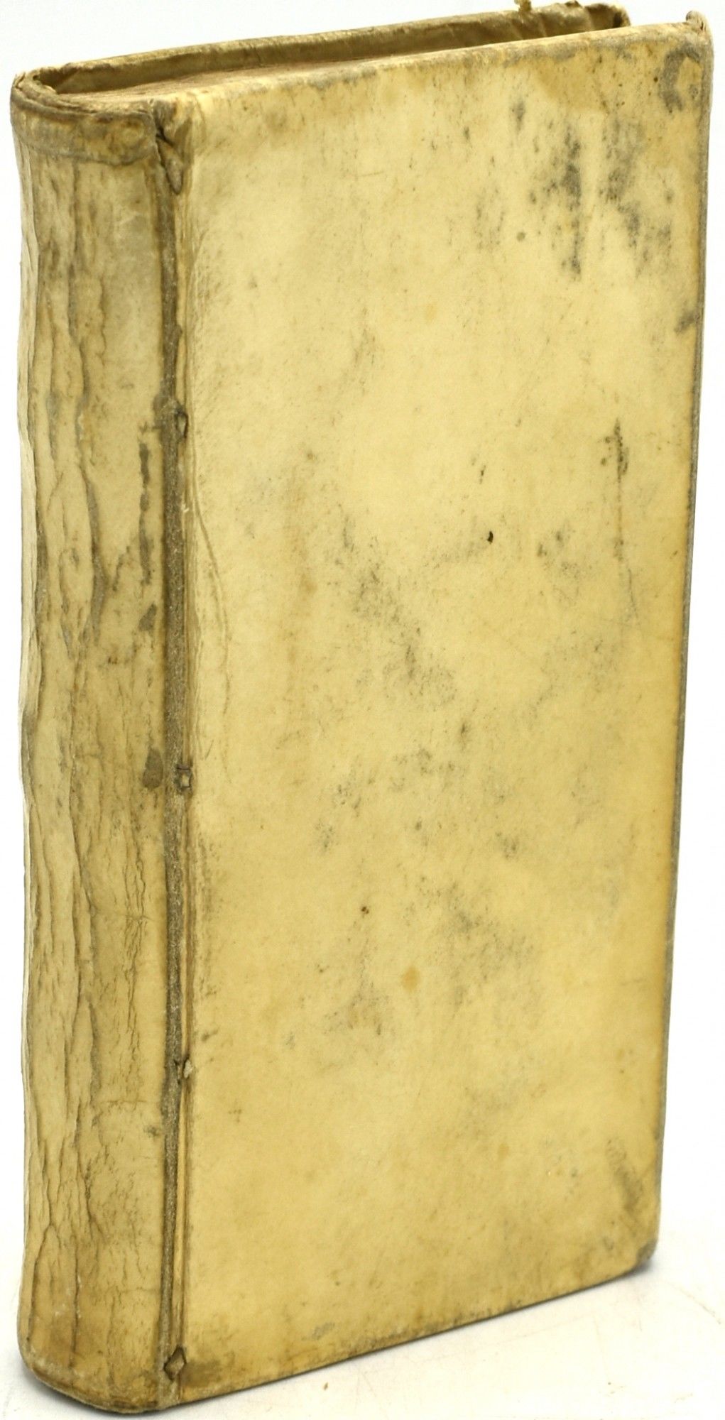 Amstelodami: Apud Danielem Elzevirium, 1677. Full Leather. Good binding. Reprint of the 1650 edition. Engraved title page, hand colored. Tailpieces and engraved initials, some hand colored. Lacking front endpaper and flyleaf, with a small mount of paper damage to the bottom of the title page, not affecting the text, and slight surface loss to the front pastedown. Contemporary owner's names to the front pastedown, and extensive marginalia and underlying by the contemporary hand. Full vellum with spine creasing and minor soiling to the binding. 260 pp. in-24. (Willems 1527). Good binding.