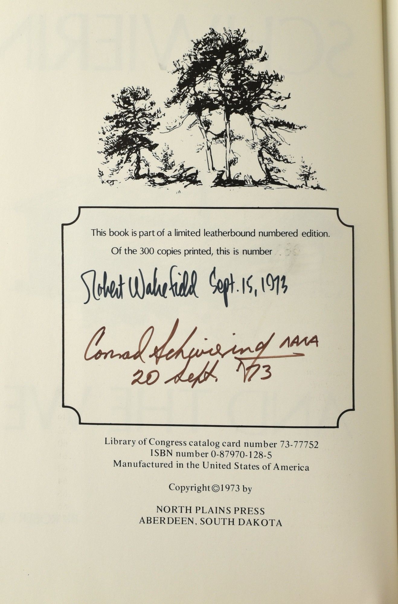 Aberdeen, South Dakota: North Plains Press, 1973. Limited Edition. Full Leather. Very Good binding. Signed. Signed by the author and artist on the limitation page; appears to have been numbered 266 of 300 copies, though the number has since been scratched out. With a typewritten letter laid in, and a reproduction of one of the illustrations; the recipients of the letter had recently purchased one of the artworks featured in the book. A bright copy. Brown leather with gilt lettering. Very Good binding.