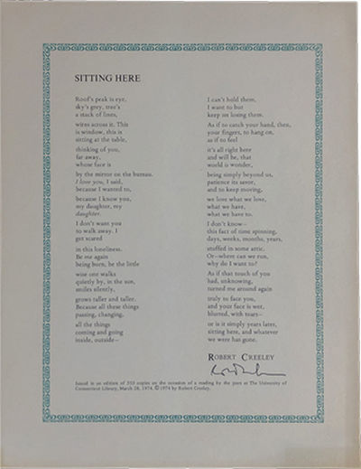 University of Connecticut Library, 1974. First Edition. Broadside. Near Fine. Broadside poem. Limited to 350 copies, signed by Creeley. Near Fine. A thin band of toning at the bottom-right corner. This was printed on the occasion of Creeley reading at the university on March 28, 1974.