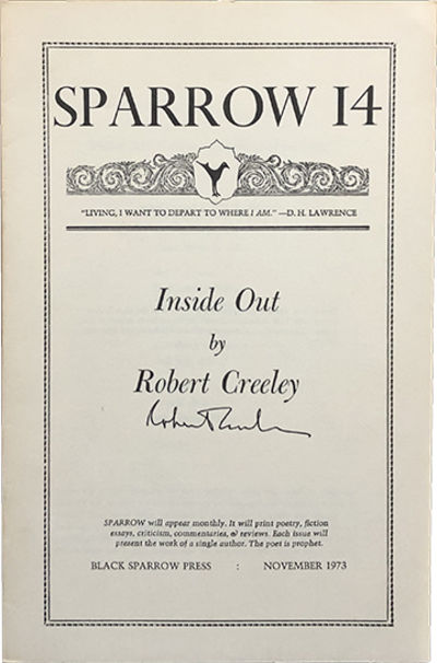 Los Angeles: Black Sparrow Press, 1973. First Edition. Paperback. Fine. Signed by Creeley on the front wrap. Fine. Square and firmly bound with two staples. A transcript of Creeley's lecture "Inside Out: Notes on the Autobiographical Mode," originally given as part of the Buffalo Conference on Autobiography. This copy is printed in black and white rather than the usual red and black.