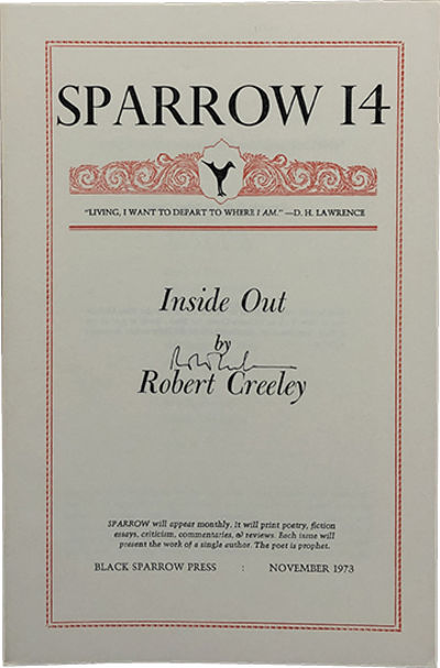 Los Angeles: Black Sparrow Press, 1973. First Edition. Paperback. Fine. Signed by Creeley on the front wrap. Fine. Square and firmly bound with two staples. A transcript of Creeley's lecture "Inside Out: Notes on the Autobiographical Mode," originally given as part of the Buffalo Conference on Autobiography.