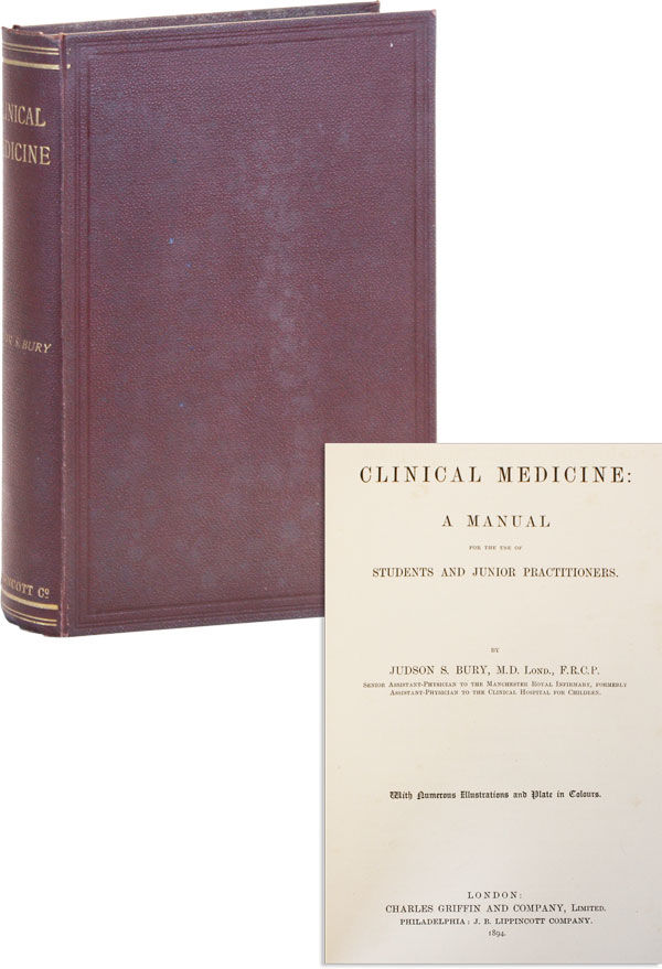 London: Charles Griffin & Co, 1894. First Edition. Octavo. Pebble-grained red cloth boards; 468pp; illus. Faint spotting to cloth, else a tight, VG or better copy. Text fresh and clean. Numerous text illustrations, one color plate illustrating spinal nerve-routes. Bury (1852-1944) long-time professor of clinical medicine at the University of Manchester, and a specialist on nervous diseases. This textbook went into standard use and was reprinted several times through the following rtwo decades. He also published in 1912 a standard text on Diseases of the Nervous System.