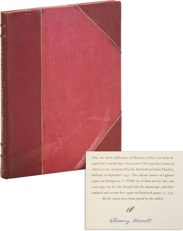 [Paris]: Harrison of Paris, 1930. First, Limited Edition. One of 375 signed, numbered copies on Pannekoek paper, of a total edition of 395. Octavo; later three-quarter morocco over maroon cloth boards; 46pp. Light scuffing to board joints (external); faint moisture stain to front and rear boards, else Near Fine. The third book of the press.
