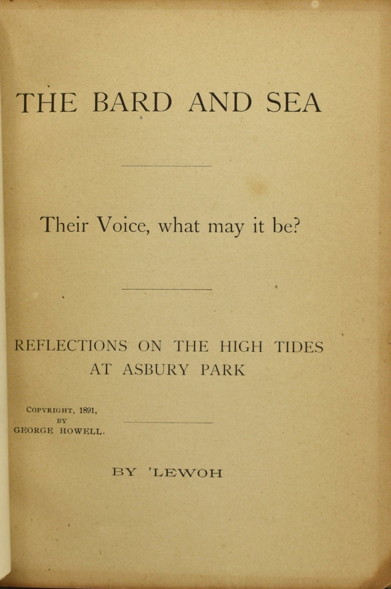 1891. Very Good binding. An obscure, and nearly unreadable epic poem. Deservedly uncommon (we find no copies on OCLC). In coated white pebbled wrappers, with a chip to the bottom corner, and loss at the spine. With a half-tone frontistpiece, "An Angry Sea Along the Coast". 40 pp.; bound with "Sunset Lake", 19 pp. Very Good binding.