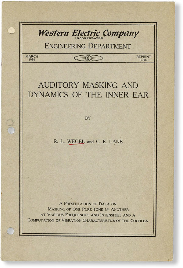 [Washington, DC: American Physical Society, 1924]. Offprint. Octavo; publisher's grey printed staplebound and hole-punched wrappers; 20pp.; graphs throughout. Light toning to extremities, else Very Good or better. "A presentation of data on masking of one pure tone by another at various frequencies and intensities and a computation of vibration characteristics of the cochlea" (upper cover). First published in "The Physical Review," Second series, Vol. 23, no. 2, February, 24, 1924, and issued here as Western Electric Company Engineering Department Reprint B-58-1.