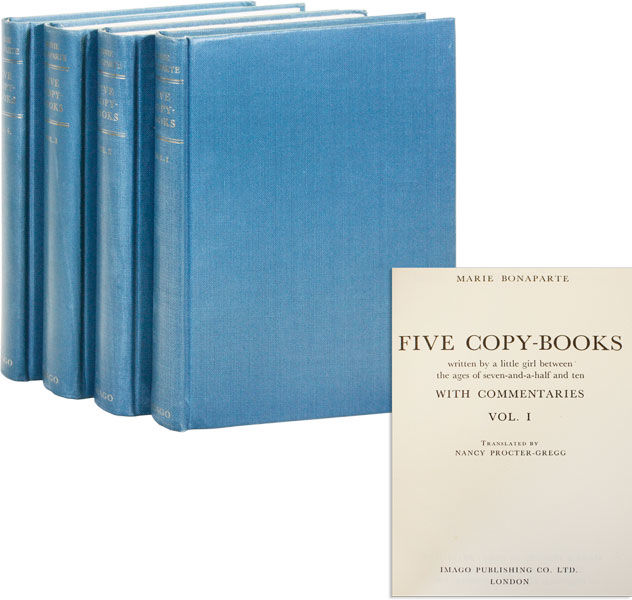 London: Imago, (1950). First, Limited Edition. 4 octavo volumes. Original green cloth with gilt spine titles; 284+396+416+329pp; illustrations & facsimiles (some folding). Limited to 1000 sets; this is set no 250. A fifth volume, containing full facsimiles of the handwritten copy books, was issued later and is not included here. Bit of sunning to spines, else a tight, Near fine set. Classic of juvenile psychology by Princess Marie Bonaparte (1882-1962), the prominent French psychologist, popularizer of psychoanalysis, disciple and patron of Sigmund Freud.