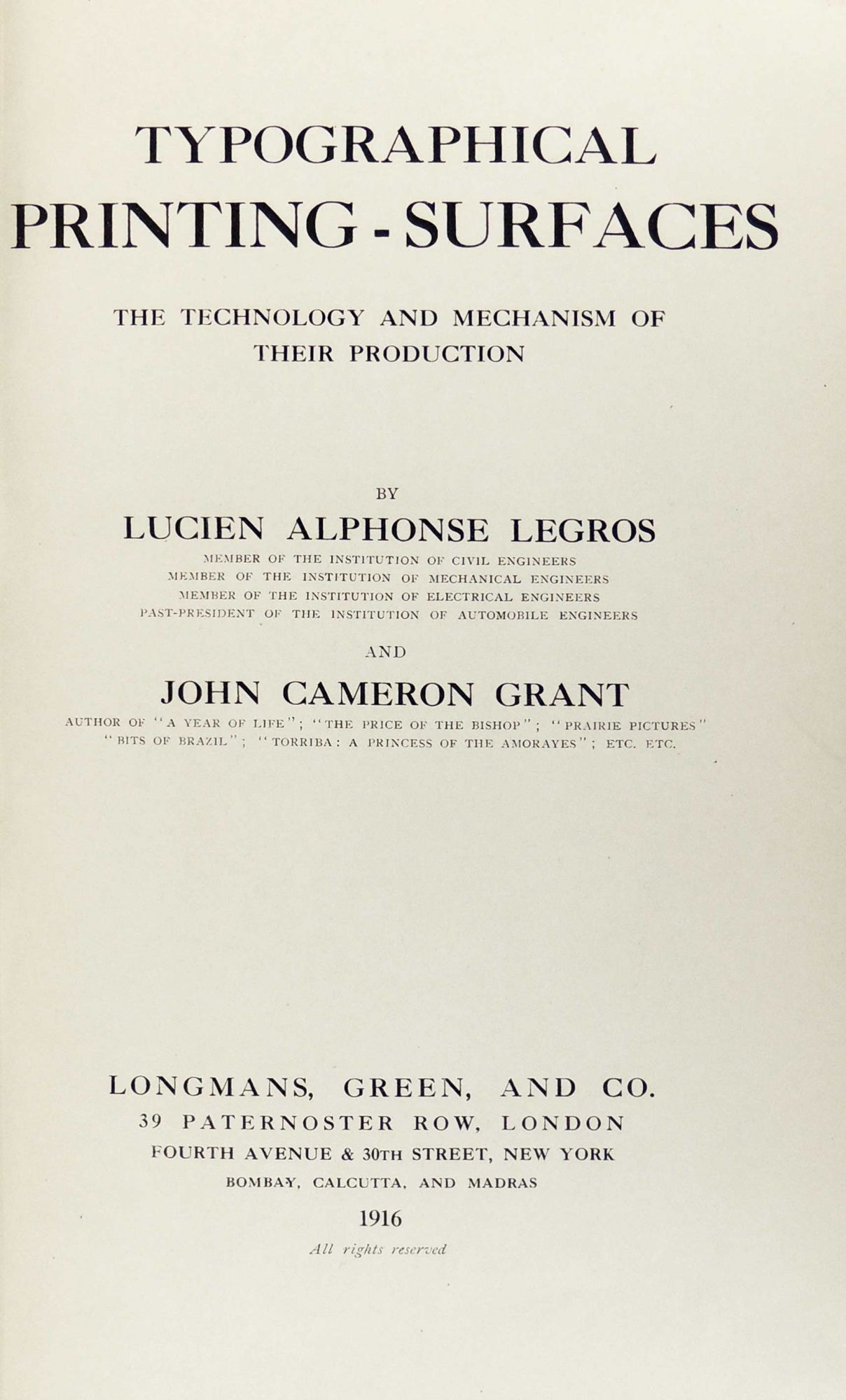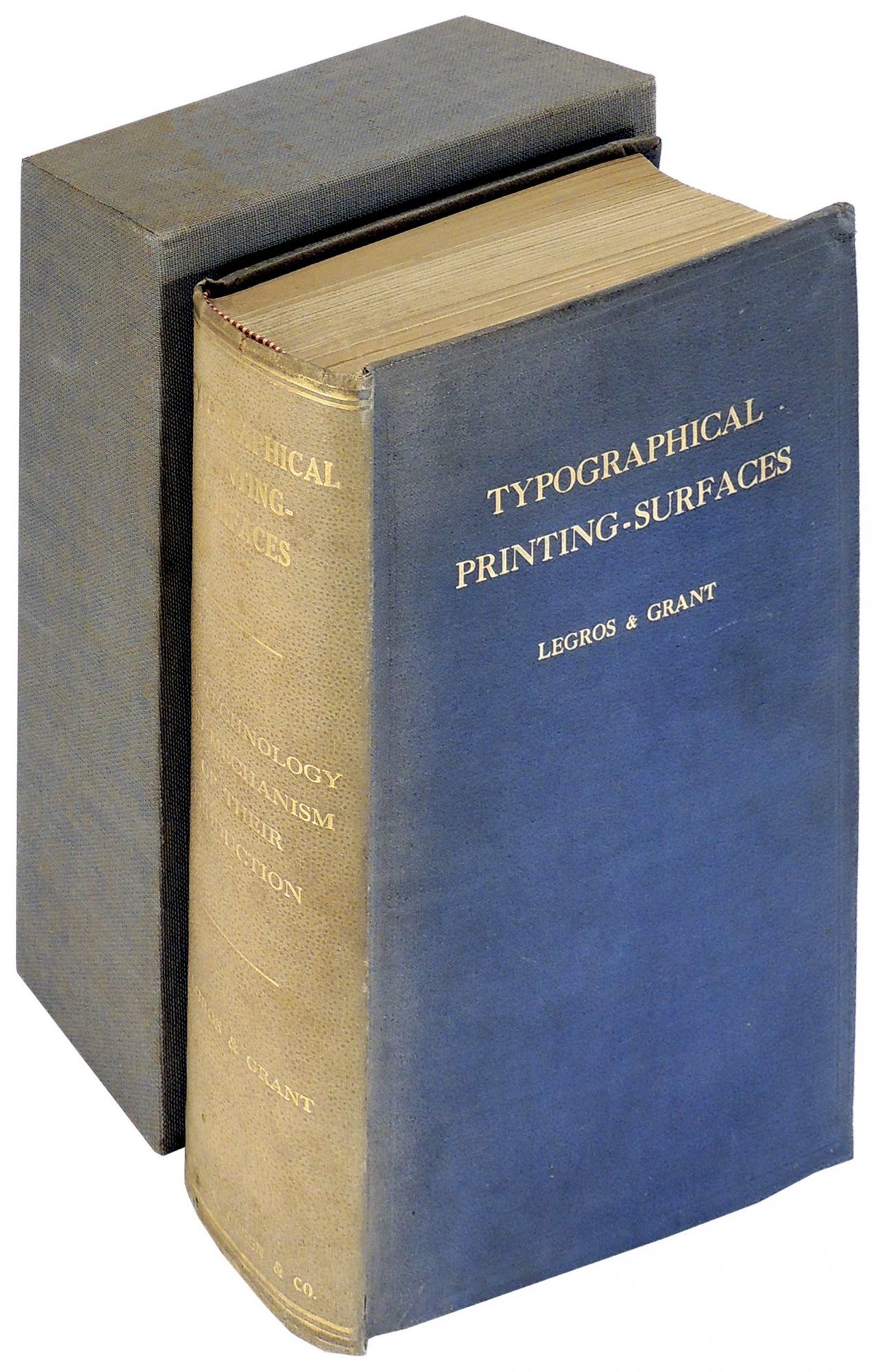 London: Longmans, Green, and Co, 1916. Hardcover. Very Good. Hardcover. Scarce. A comprehensive and scholarly treatise on all aspects of typographical printing surfaces and the processes and mechanisms of their production with the goal of making it the standard text book on the subject. The authors acknowledge the considerable trouble they had in producing the book but call it a labor of love. The work first covers various aspects of type - dimensions, faces, proportions and weight, legibility, punch cutting, matrices, and moulds. In following sections the authors discuss various ways of creating texts - keyboards, casting machines, composing and distributing machines, and so much more. The final sections cover ancient and modern scripts; British and American patents by date issued; a technical vocabulary in English, French and German; a list of illustrations; and an extensive index. Bound in the original blue cloth with gilt titling to spine and front cover. Spine is faded, corners bumped. pastedowns and free endpapers appear to be more recent. Interior pages are in very good condition. Altogether an excellent copy of this monumental work. Housed in a grey cloth slipcase. 732 pages. PRINT/040320.