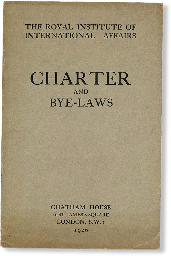 London: Royal Institute of International Affairs, 1926. First Edition. Staple-bound pamphlet. Printed card wrappers; 24pp. Light toning and wear; Very Good. First publication of the Royal charter issued to this foreign policy policy group, founded after WW1 by Lord Cecil and others. An American analogue, the Council on Foreign Relations, was a product of the same post-war meetings.