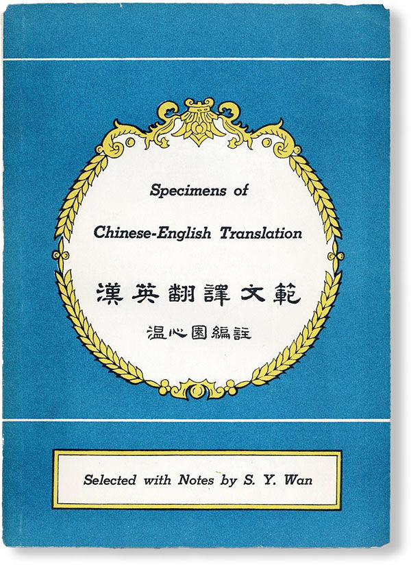 Hong Kong: World Book Store, [1959]. First Edition. Octavo (ca. 19cm.); publisher's blue decorative card wrappers; xviii,163pp. Wrappers a bit cockled from exposure to damp, light wear from handling, else Very Good and sound. Text in Chinese and English throughout. Date of publication based on date of Foreword (p. xv). Includes examples by James Legge, Herbert Giles, Arthur Waley, Pearl S. Buck, and others. Scarce; OCLC locates two copies in North America as of April, 2020, at the Brooklyn Public Library and Purdue-Fort Wayne.