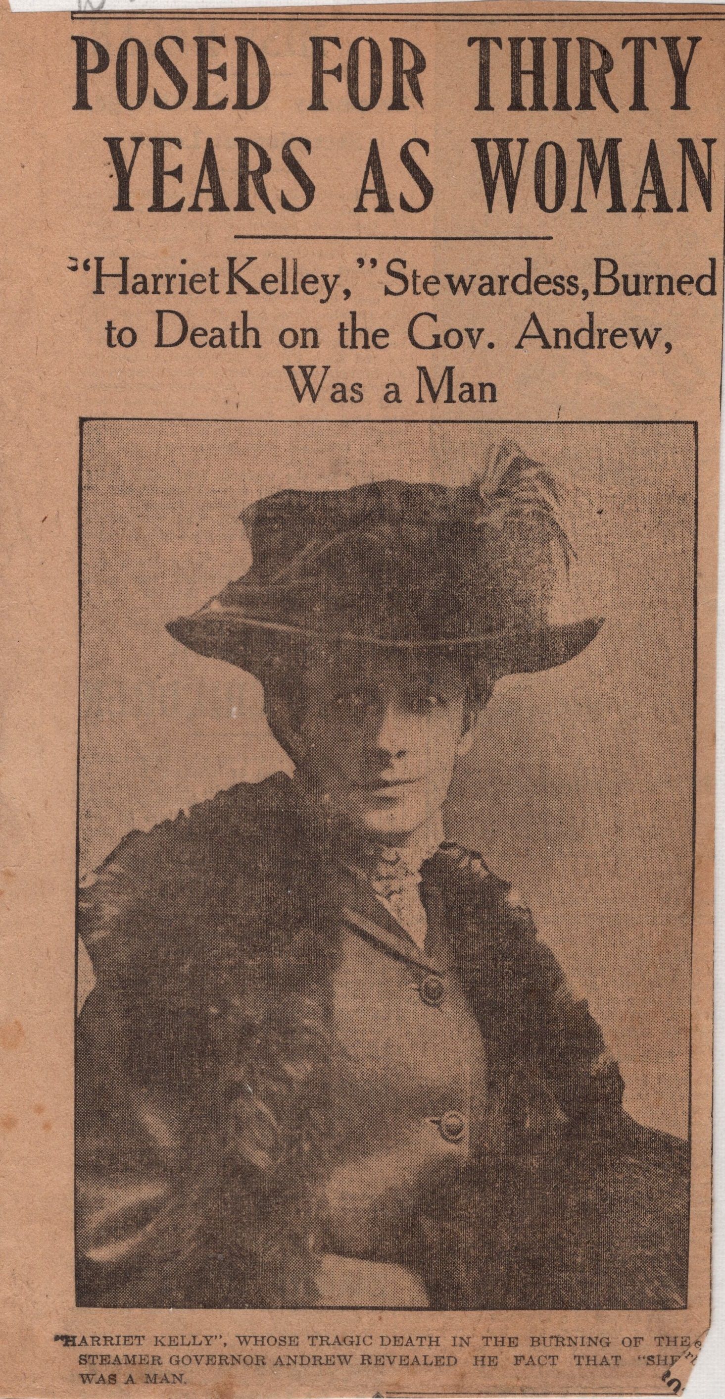 Newpaper Clipping: Harriet Kelley, Stewardess, posed for thirty years as a woman, discovered only after SS Governor Andrew Fire