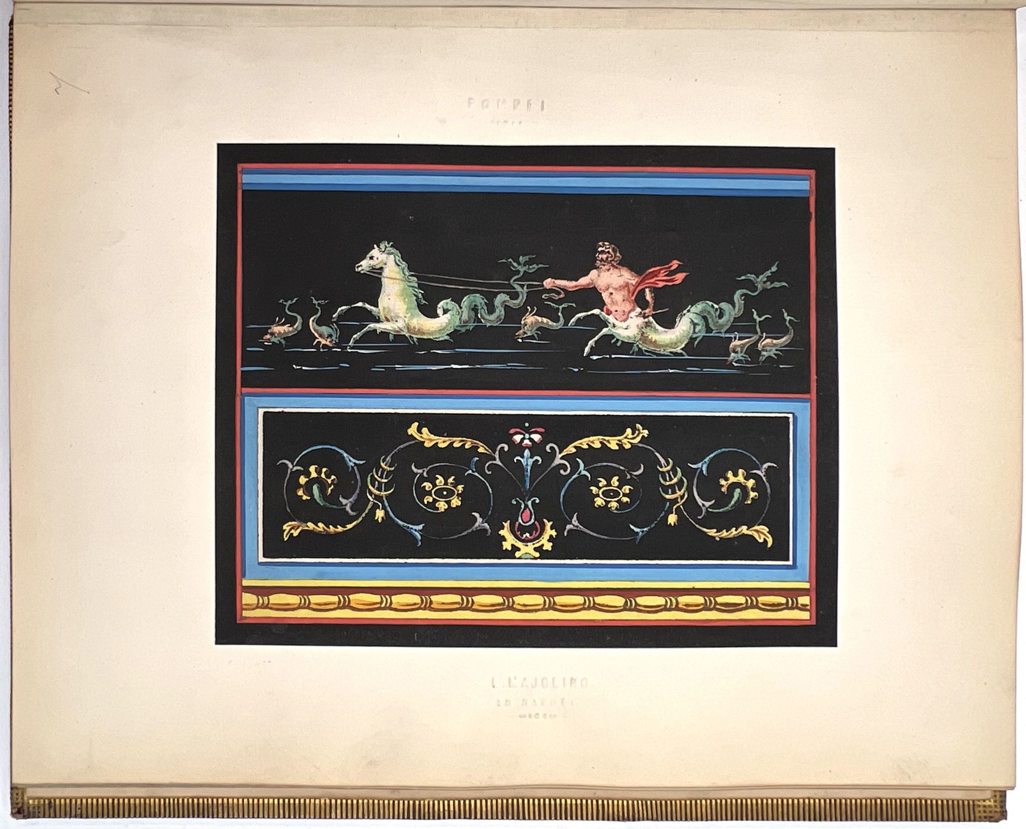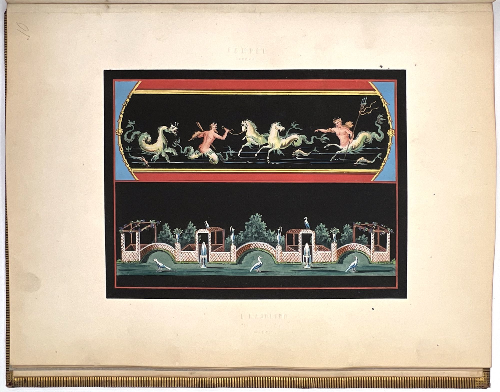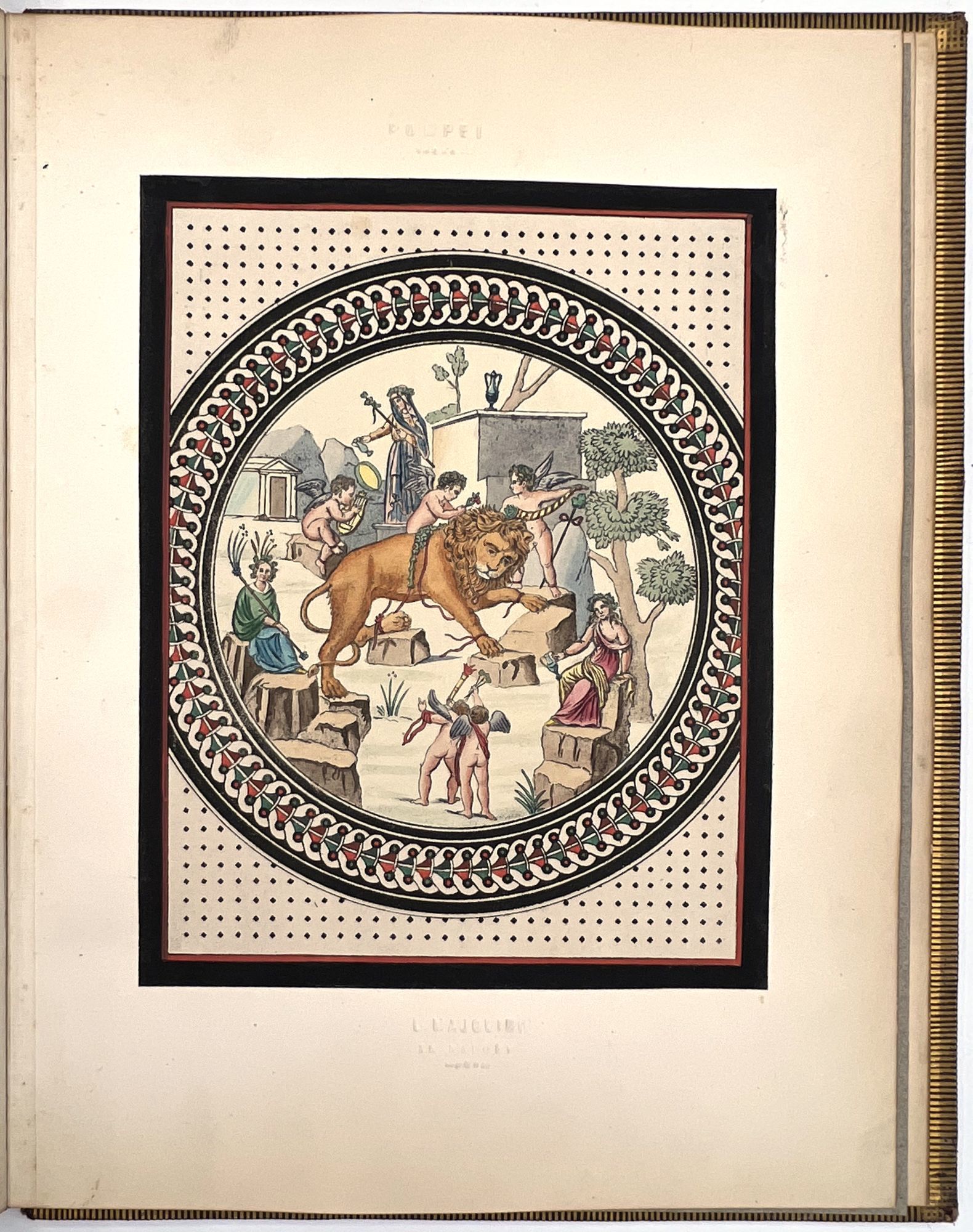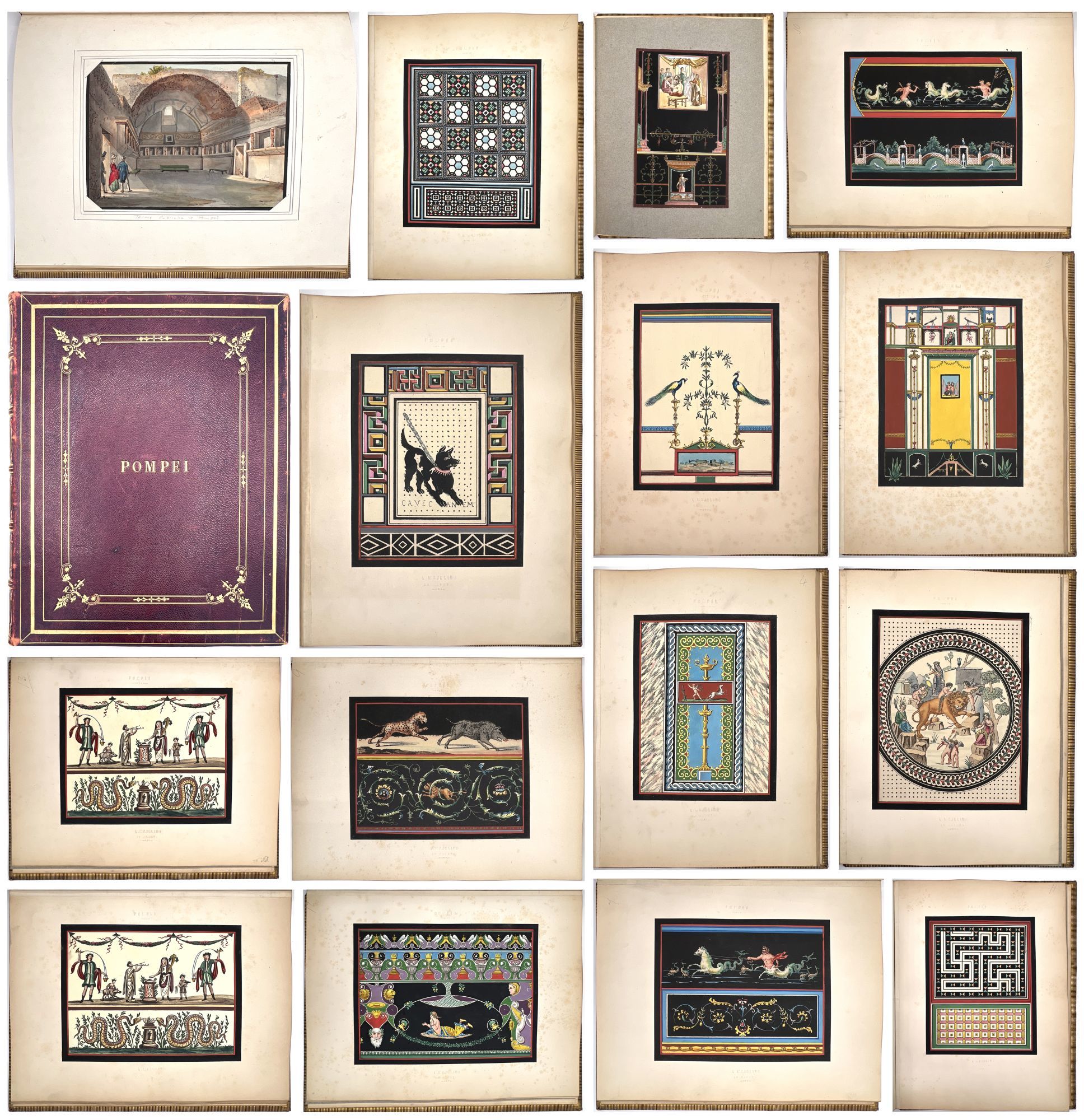 Naples, Italy, 1871. Very good. Scattered foxing, extremities rubbed, remains of previous modern adhesive label to front pastedown.. A superb souvenir album created by an English or American tourist c.1871, showing the strong hold the ruins of Pompeii held over the touristic imagination in the Victorian era. From the beginning of the century, no European Grand Tour was complete without a visit to, and a souvenir from, the archaeological site, and the present volume is an excellent example of the kind of souvenirs sought by such well-to-do British and American tourists. The album was presumably bound after the fact, but contains fourteen (14) lithographs and engravings hand-finished in watercolor, gouache, and hand stencil/pochoir, that would have been purchased in or around Pompeii as a tourist souvenir. Each is contained in a thick card mat, embossed in blind ("Pompei" and "L Majolino In Napoli"). They each depict a different design from the ruins of Pompeii, such as the famous "cave canem" ("beware of dog") mosaic at the entrance to Pompeii's House of the Tragic Poet. Other images include Neptune driving his chariot, sea serpents, a cheetah hunting a boar, and complex mosaic designs featuring what would today be referred to as a swastika, but in Ancient Rome referenced lightning bolts and the gods. There is an additional hand-colored print without a mat tipped in to the rear, and an additional hand-colored etching depicting tourists visiting the ruins in the front of the album. Single vol. (12.5" by 10"), sixteen leaves with hand-colored plates bound in contemporary gold-stamped roan.