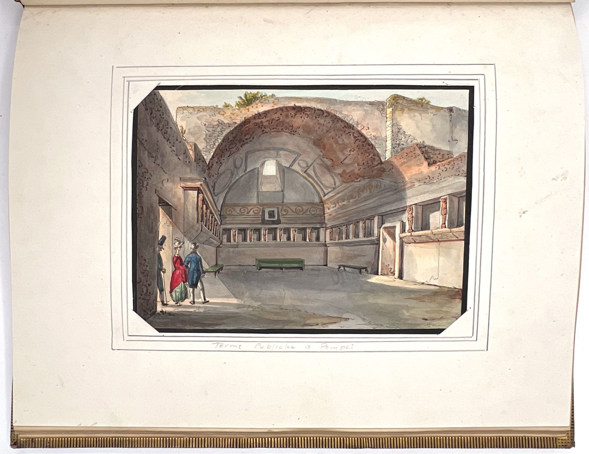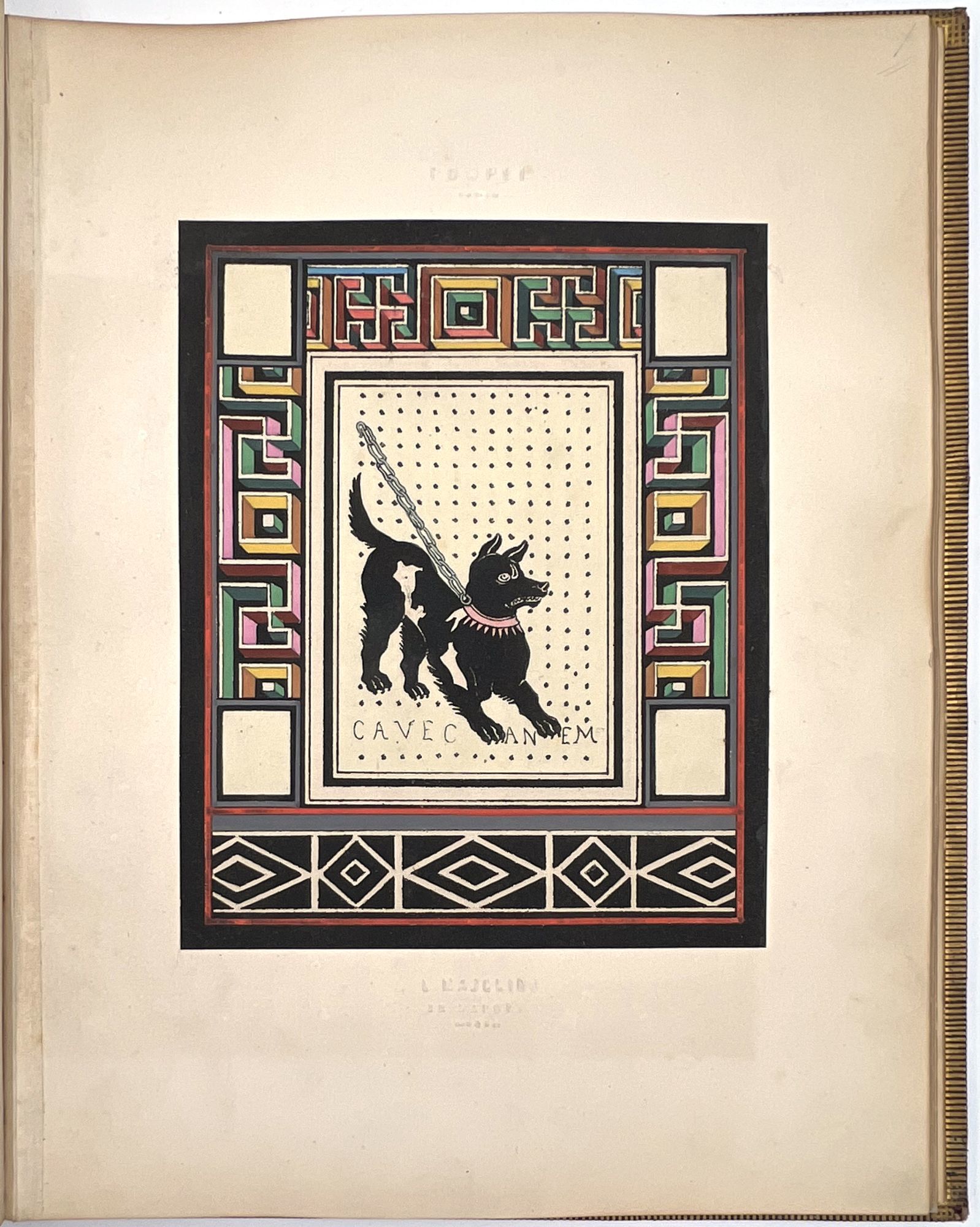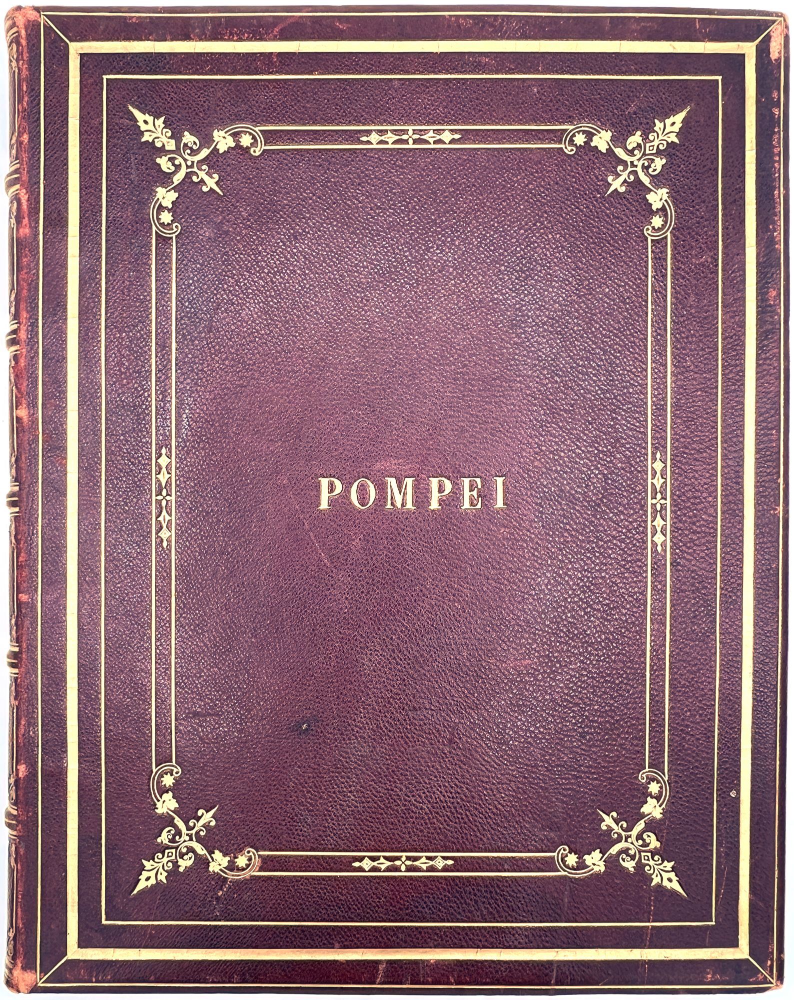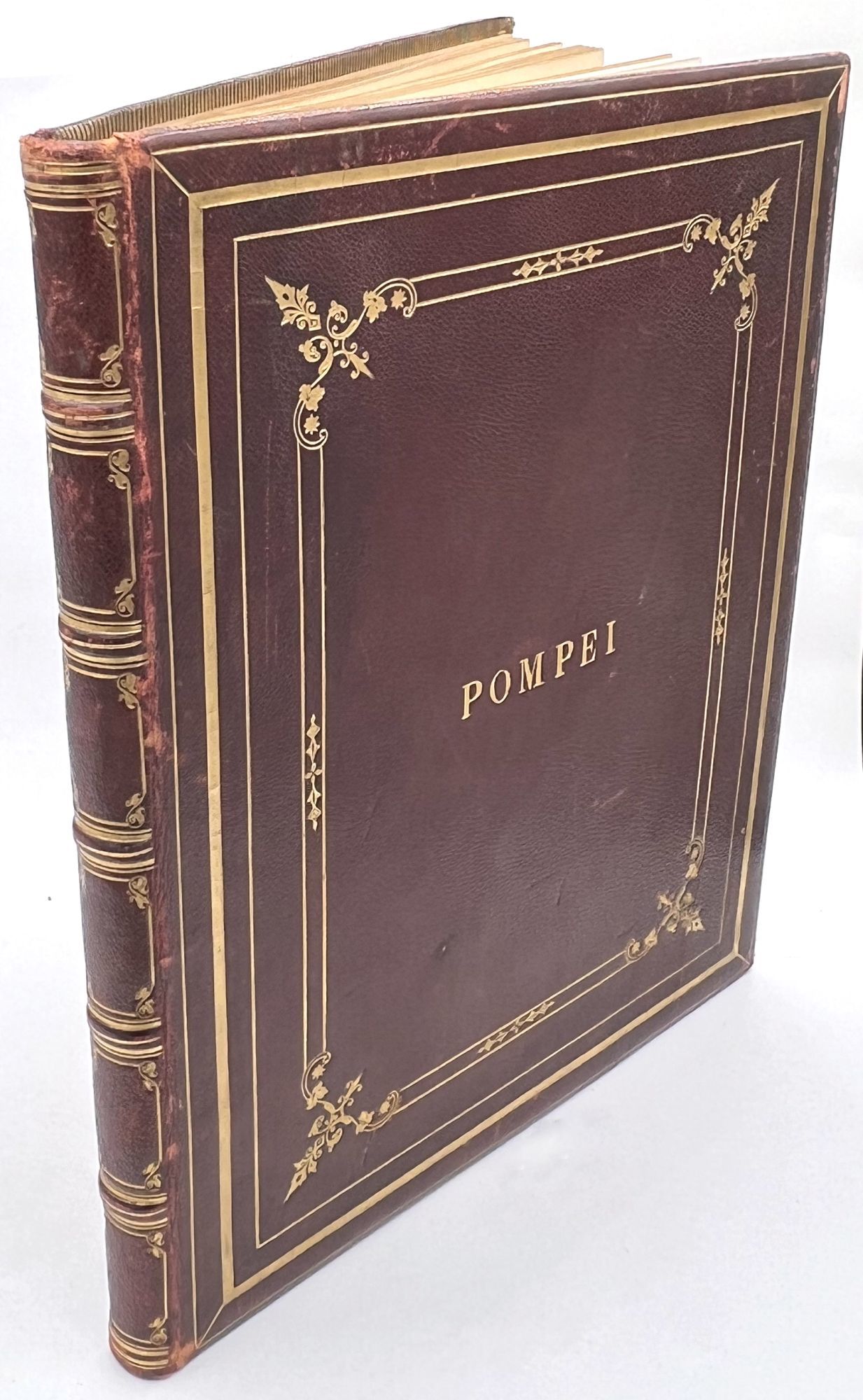 Naples, Italy, 1871. Very good. Scattered foxing, extremities rubbed, remains of previous modern adhesive label to front pastedown.. A superb souvenir album created by an English or American tourist c.1871, showing the strong hold the ruins of Pompeii held over the touristic imagination in the Victorian era. From the beginning of the century, no European Grand Tour was complete without a visit to, and a souvenir from, the archaeological site, and the present volume is an excellent example of the kind of souvenirs sought by such well-to-do British and American tourists. The album was presumably bound after the fact, but contains fourteen (14) lithographs and engravings hand-finished in watercolor, gouache, and hand stencil/pochoir, that would have been purchased in or around Pompeii as a tourist souvenir. Each is contained in a thick card mat, embossed in blind ("Pompei" and "L Majolino In Napoli"). They each depict a different design from the ruins of Pompeii, such as the famous "cave canem" ("beware of dog") mosaic at the entrance to Pompeii's House of the Tragic Poet. Other images include Neptune driving his chariot, sea serpents, a cheetah hunting a boar, and complex mosaic designs featuring what would today be referred to as a swastika, but in Ancient Rome referenced lightning bolts and the gods. There is an additional hand-colored print without a mat tipped in to the rear, and an additional hand-colored etching depicting tourists visiting the ruins in the front of the album. Single vol. (12.5" by 10"), sixteen leaves with hand-colored plates bound in contemporary gold-stamped roan.