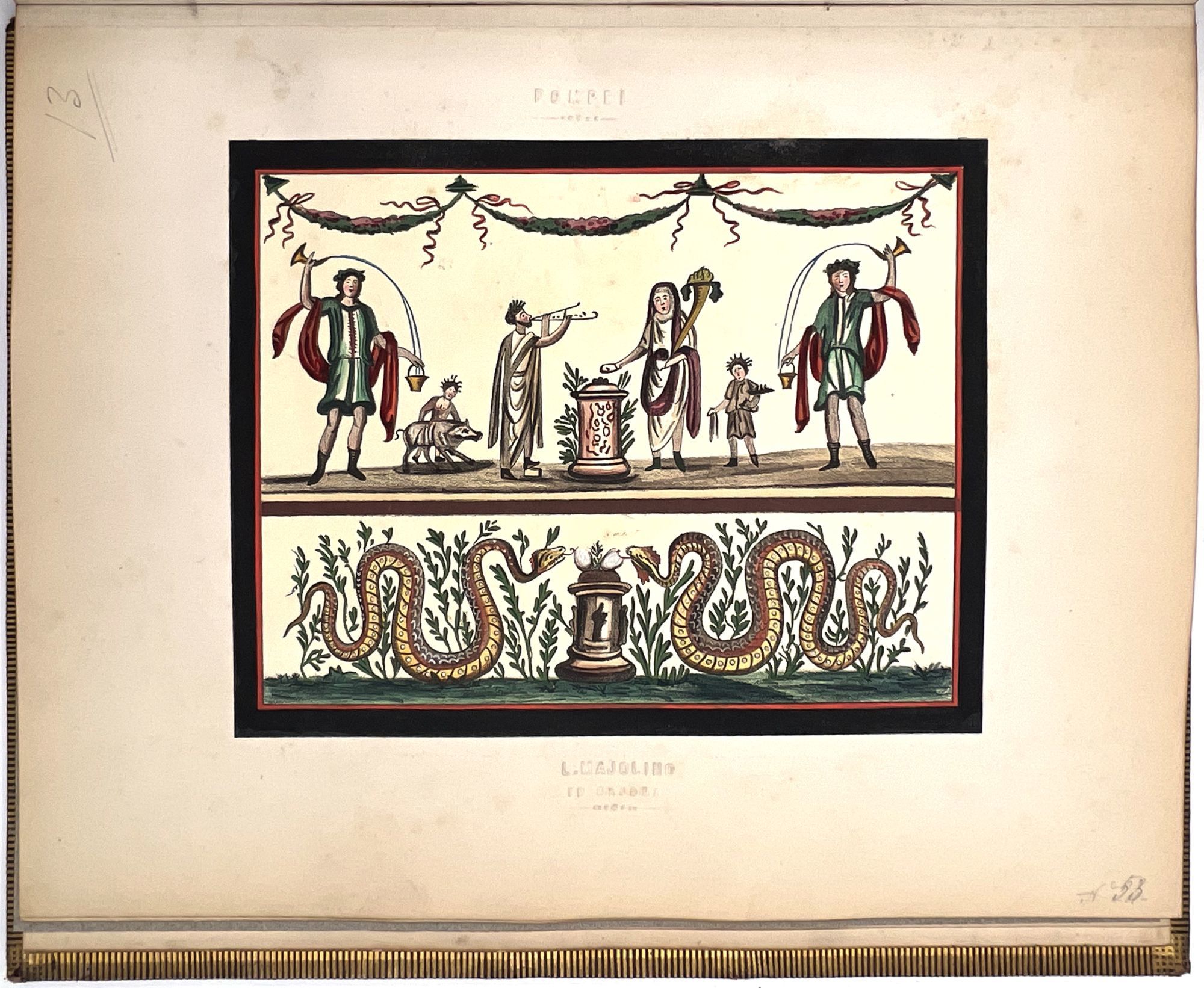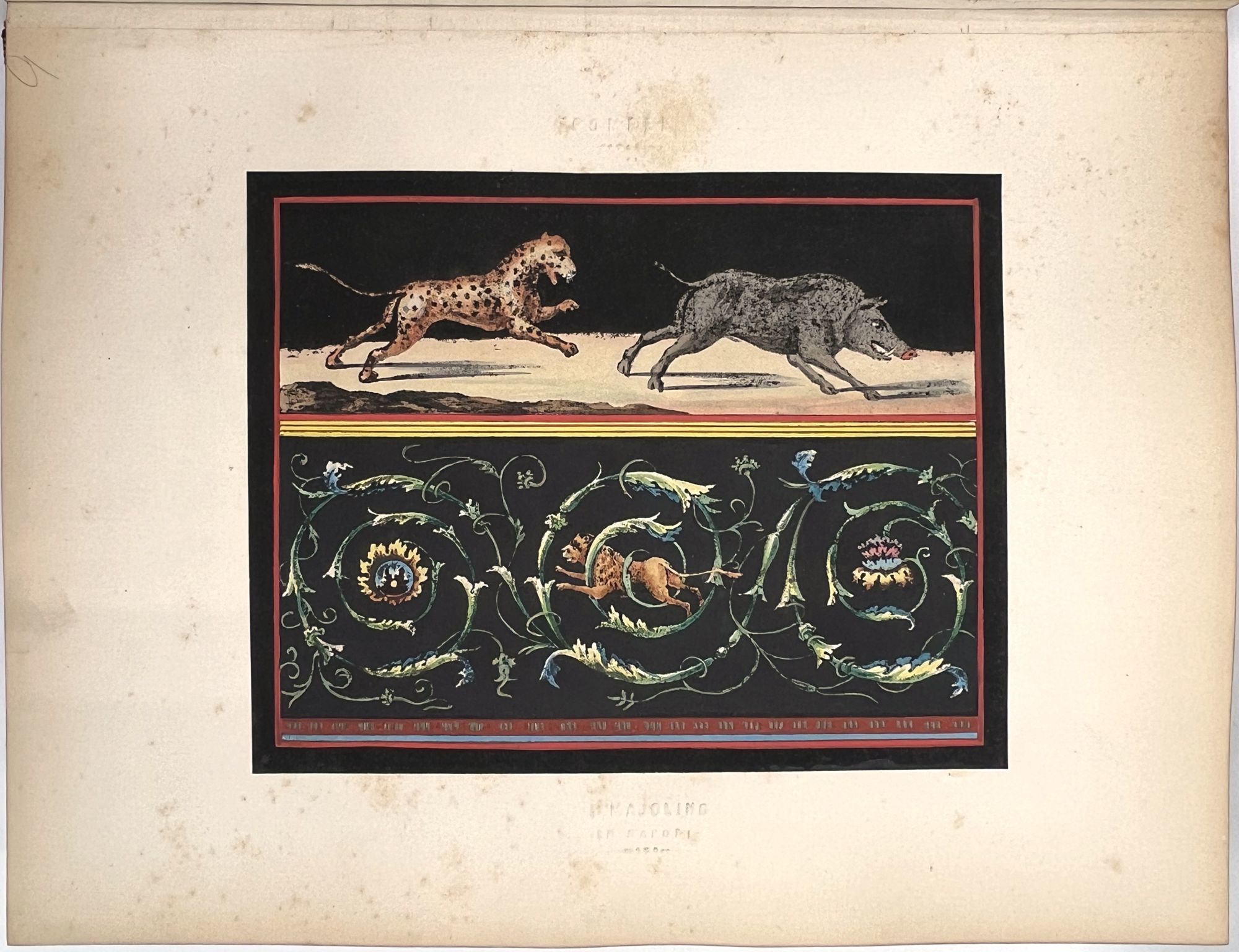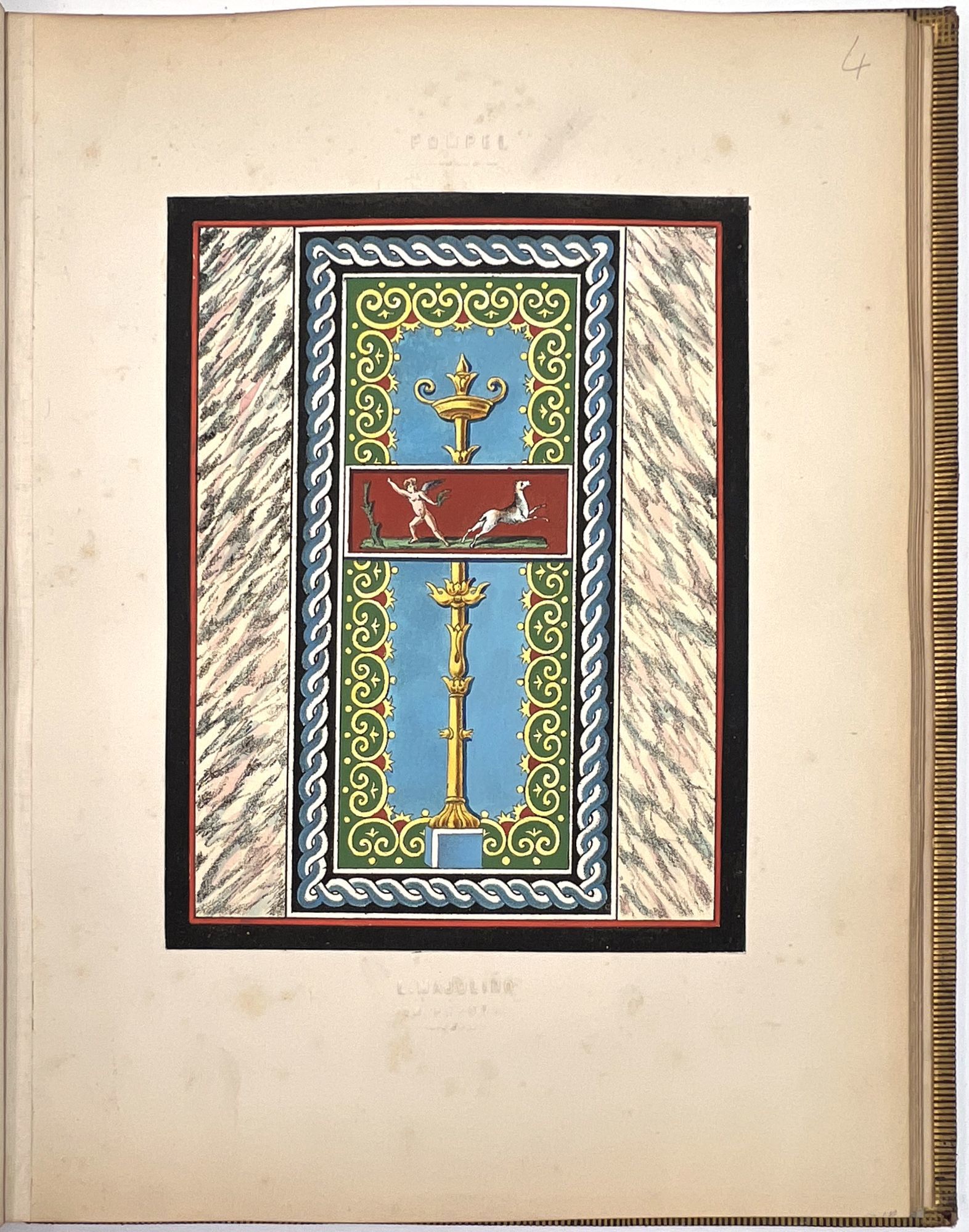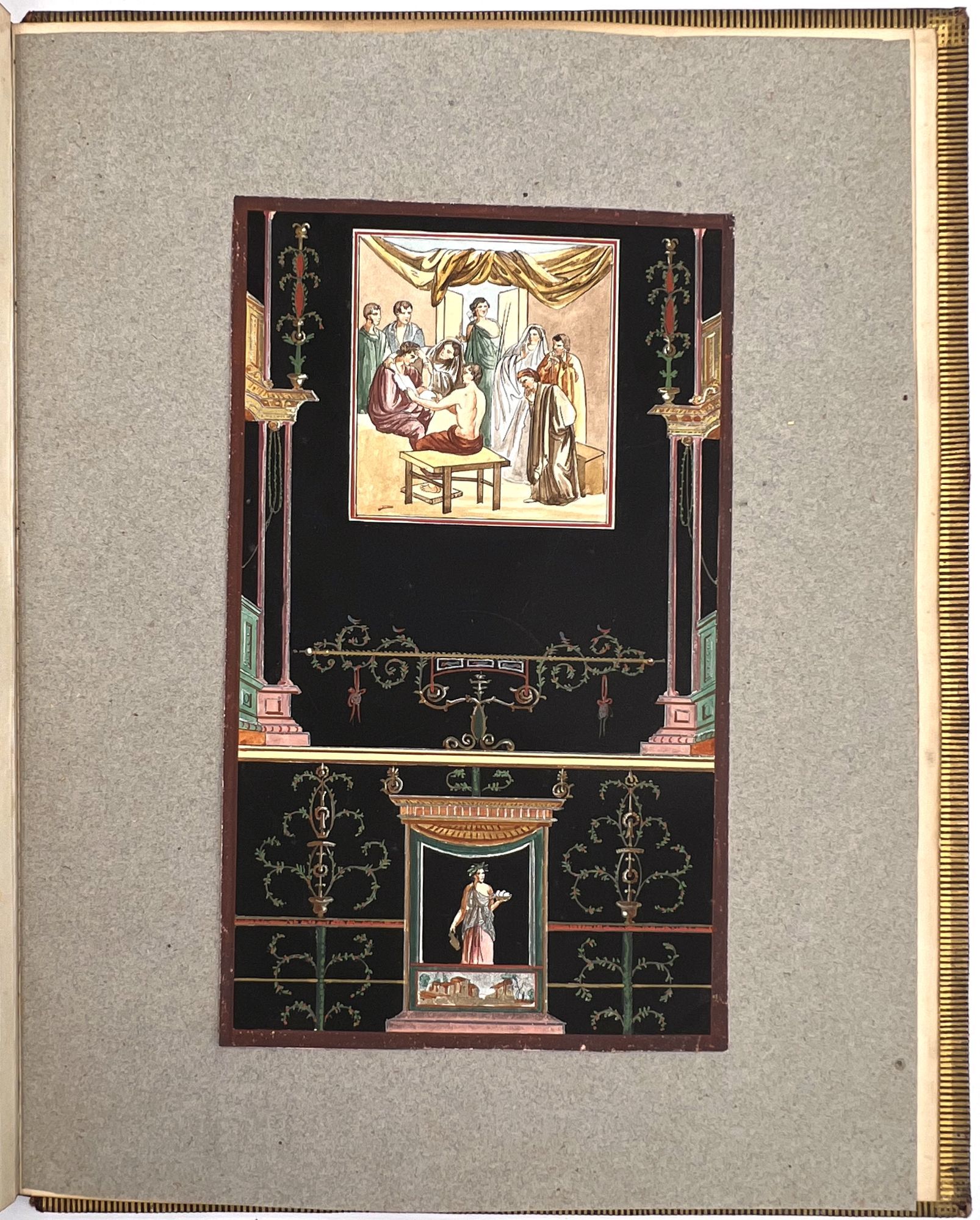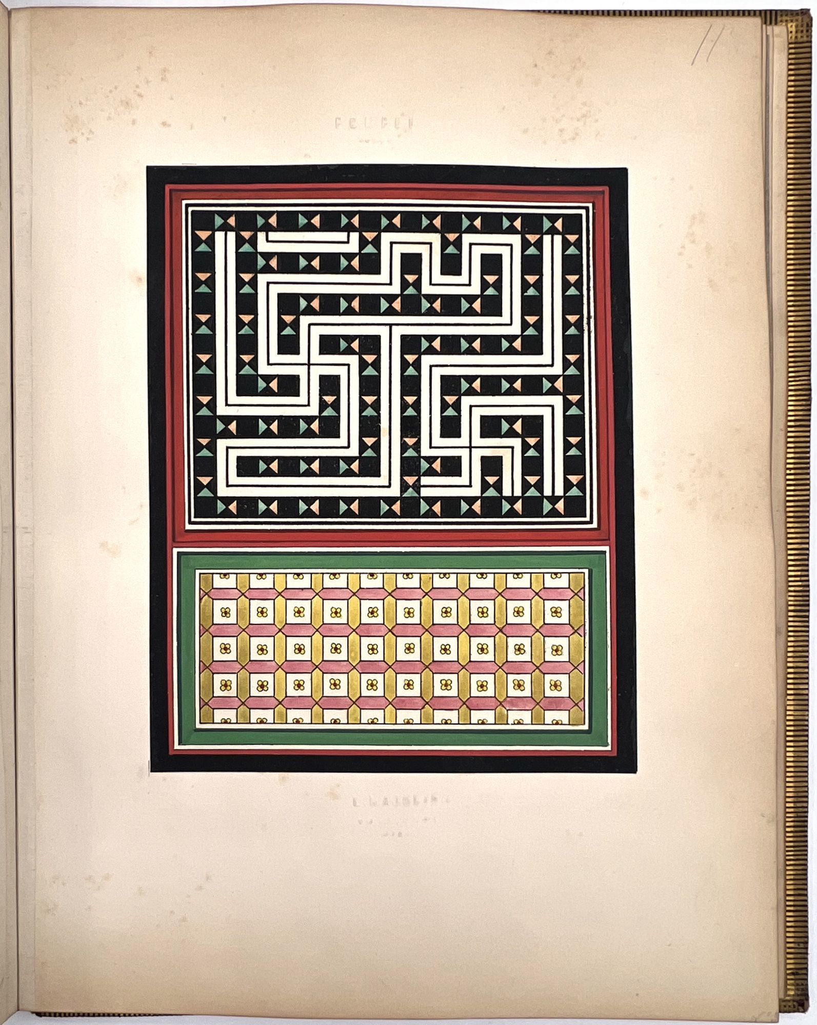 Naples, Italy, 1871. Very good. Scattered foxing, extremities rubbed, remains of previous modern adhesive label to front pastedown.. A superb souvenir album created by an English or American tourist c.1871, showing the strong hold the ruins of Pompeii held over the touristic imagination in the Victorian era. From the beginning of the century, no European Grand Tour was complete without a visit to, and a souvenir from, the archaeological site, and the present volume is an excellent example of the kind of souvenirs sought by such well-to-do British and American tourists. The album was presumably bound after the fact, but contains fourteen (14) lithographs and engravings hand-finished in watercolor, gouache, and hand stencil/pochoir, that would have been purchased in or around Pompeii as a tourist souvenir. Each is contained in a thick card mat, embossed in blind ("Pompei" and "L Majolino In Napoli"). They each depict a different design from the ruins of Pompeii, such as the famous "cave canem" ("beware of dog") mosaic at the entrance to Pompeii's House of the Tragic Poet. Other images include Neptune driving his chariot, sea serpents, a cheetah hunting a boar, and complex mosaic designs featuring what would today be referred to as a swastika, but in Ancient Rome referenced lightning bolts and the gods. There is an additional hand-colored print without a mat tipped in to the rear, and an additional hand-colored etching depicting tourists visiting the ruins in the front of the album. Single vol. (12.5" by 10"), sixteen leaves with hand-colored plates bound in contemporary gold-stamped roan.