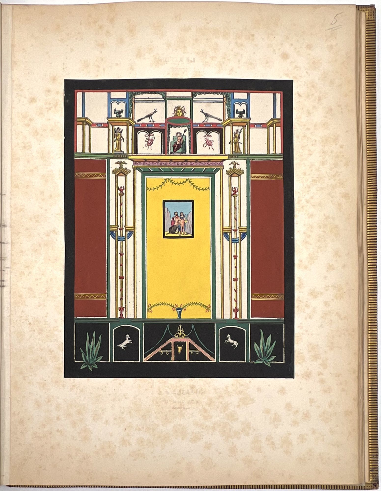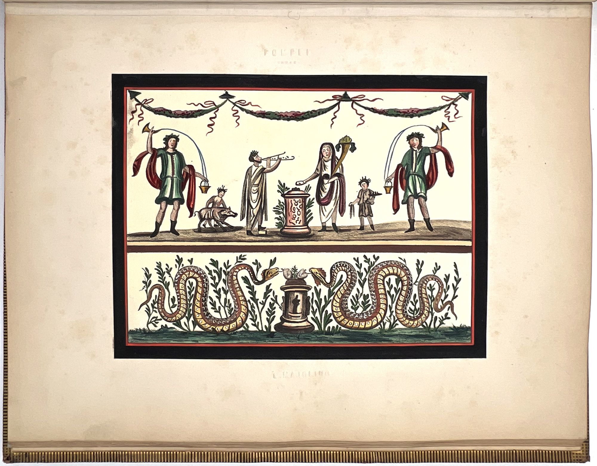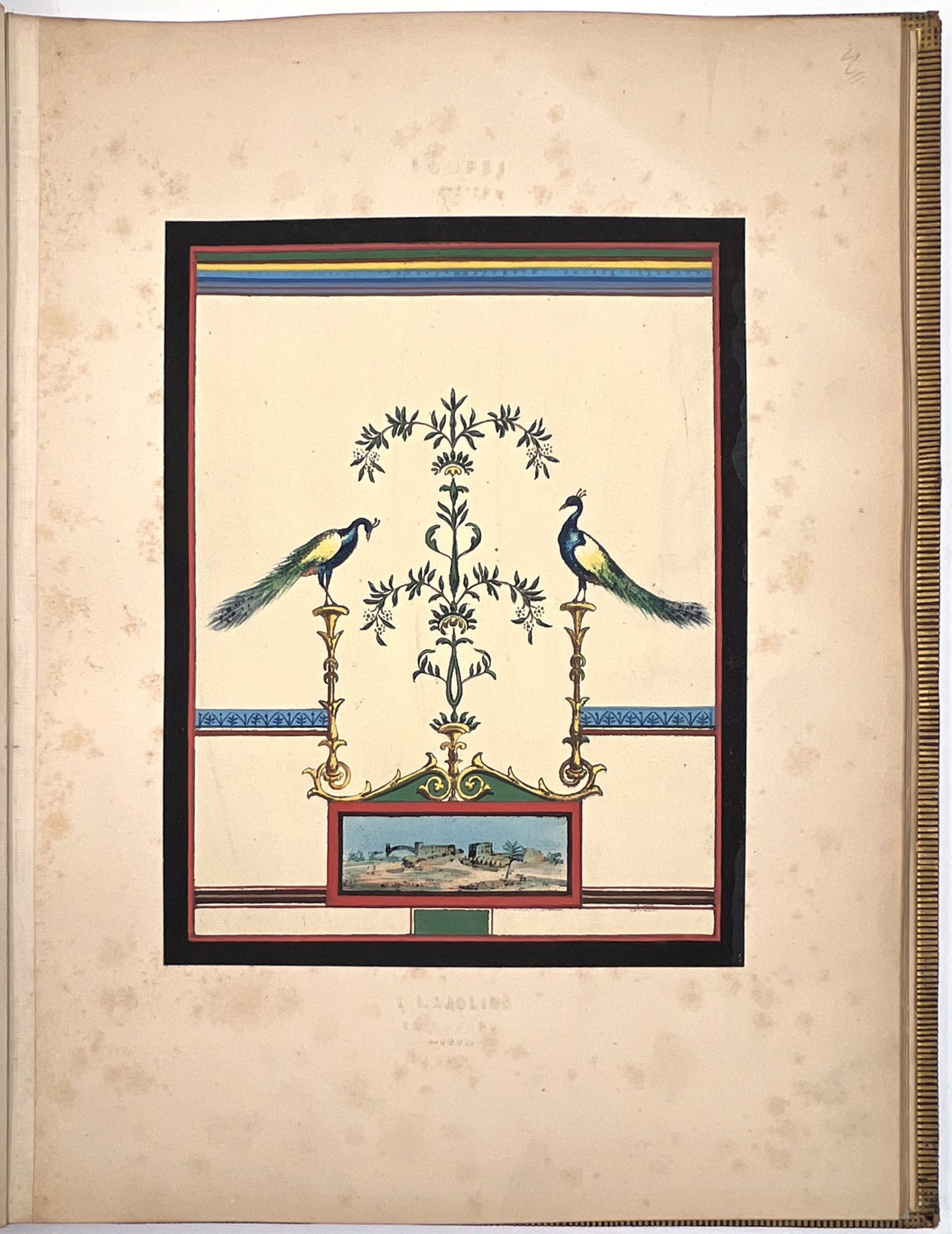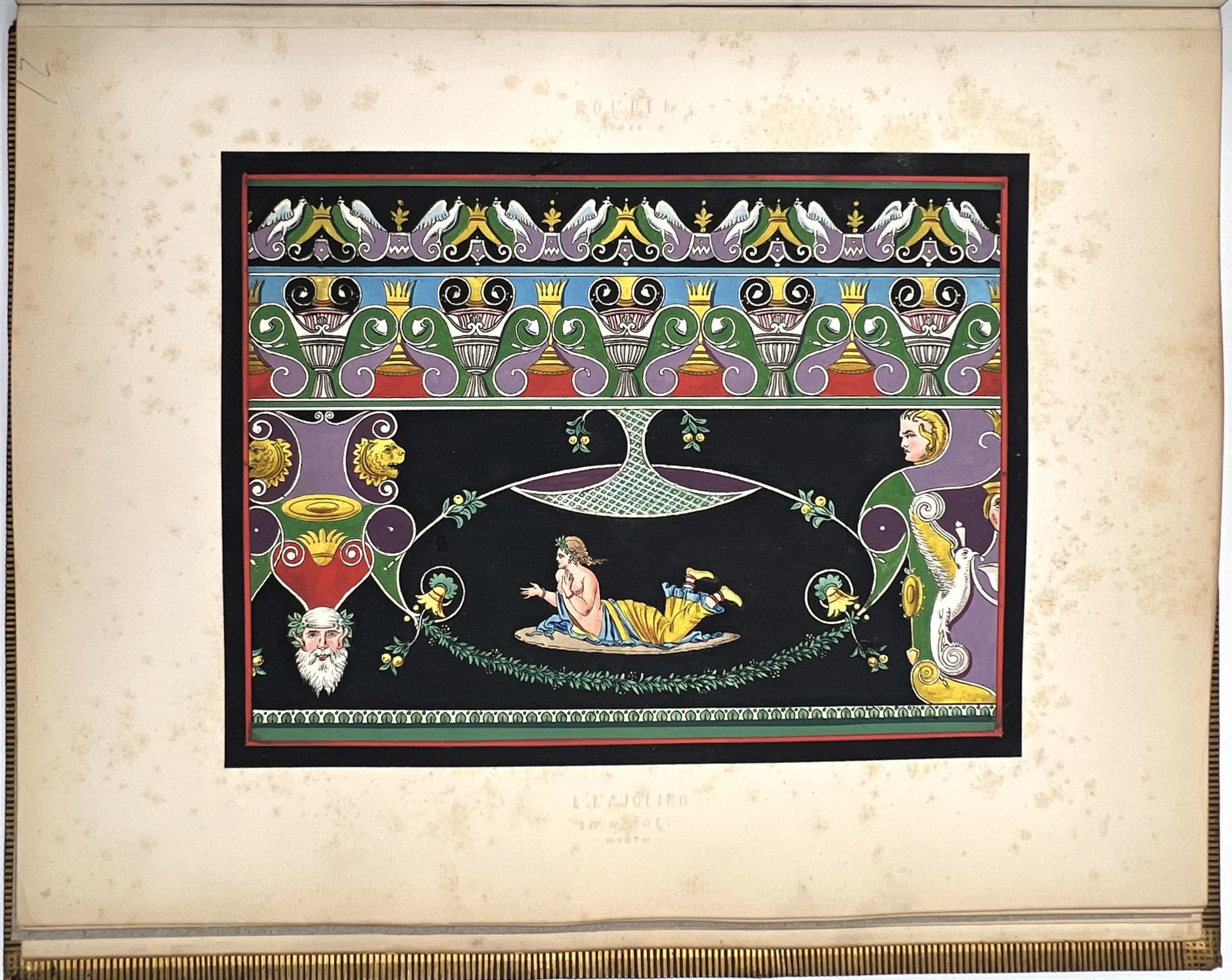 Naples, Italy, 1871. Very good. Scattered foxing, extremities rubbed, remains of previous modern adhesive label to front pastedown.. A superb souvenir album created by an English or American tourist c.1871, showing the strong hold the ruins of Pompeii held over the touristic imagination in the Victorian era. From the beginning of the century, no European Grand Tour was complete without a visit to, and a souvenir from, the archaeological site, and the present volume is an excellent example of the kind of souvenirs sought by such well-to-do British and American tourists. The album was presumably bound after the fact, but contains fourteen (14) lithographs and engravings hand-finished in watercolor, gouache, and hand stencil/pochoir, that would have been purchased in or around Pompeii as a tourist souvenir. Each is contained in a thick card mat, embossed in blind ("Pompei" and "L Majolino In Napoli"). They each depict a different design from the ruins of Pompeii, such as the famous "cave canem" ("beware of dog") mosaic at the entrance to Pompeii's House of the Tragic Poet. Other images include Neptune driving his chariot, sea serpents, a cheetah hunting a boar, and complex mosaic designs featuring what would today be referred to as a swastika, but in Ancient Rome referenced lightning bolts and the gods. There is an additional hand-colored print without a mat tipped in to the rear, and an additional hand-colored etching depicting tourists visiting the ruins in the front of the album. Single vol. (12.5" by 10"), sixteen leaves with hand-colored plates bound in contemporary gold-stamped roan.